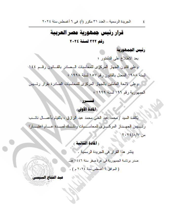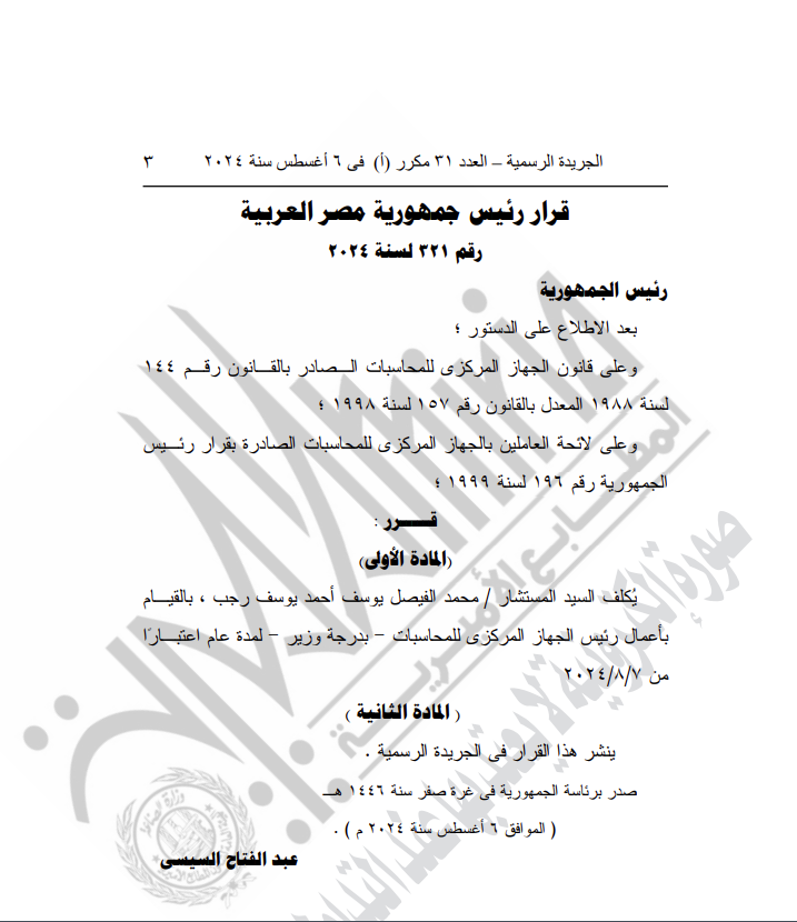 -القرار الجمهوري الجديد رقم 321 لسنة 2024، بتكليف المستشار محمد الفيصل يوسف أحمد يوسف رجب، بالقيـام بأعمال رئيس الجهاز المركزى للمحاسبات - بدرجة وزير لمدة عام اعتبـارًا من 7/8/2024.