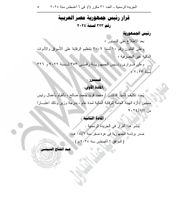 نشرت الجريدة الرسمية في عددها رقم 31 مكرر (أ)، الصادر في 6 أغسطس 2024، قرارا جمهوريا جديدا للرئيس عبد الفتاح السيسي رقم 323 لسنة 2024، بتكليف الدكتور محمد فريد محمد صالح، بالقيام بأعمال رئيس مجلس إدارة الهيئة العامة للرقابة المالية لمدة عام.