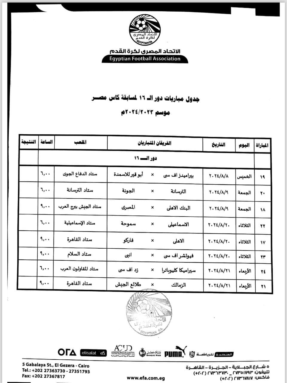 مواعيد دور الـ 16 لبطولة كأس مصر