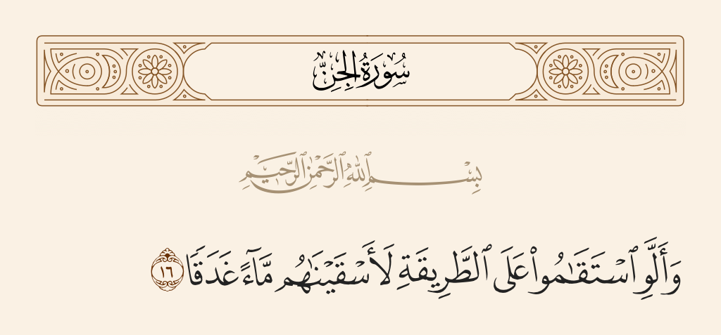 قال تعالى: «وَأَنْ لَوِ اسْتَقامُوا عَلَى الطَّرِيقَةِ لَأَسْقَيْناهُمْ ماءً غَدَقًا (16) لِنَفْتِنَهُمْ فِيهِ وَمَنْ يُعْرِضْ عَنْ ذِكْرِ رَبِّهِ يَسْلُكْهُ عَذابًا صَعَدًا (١٧)».