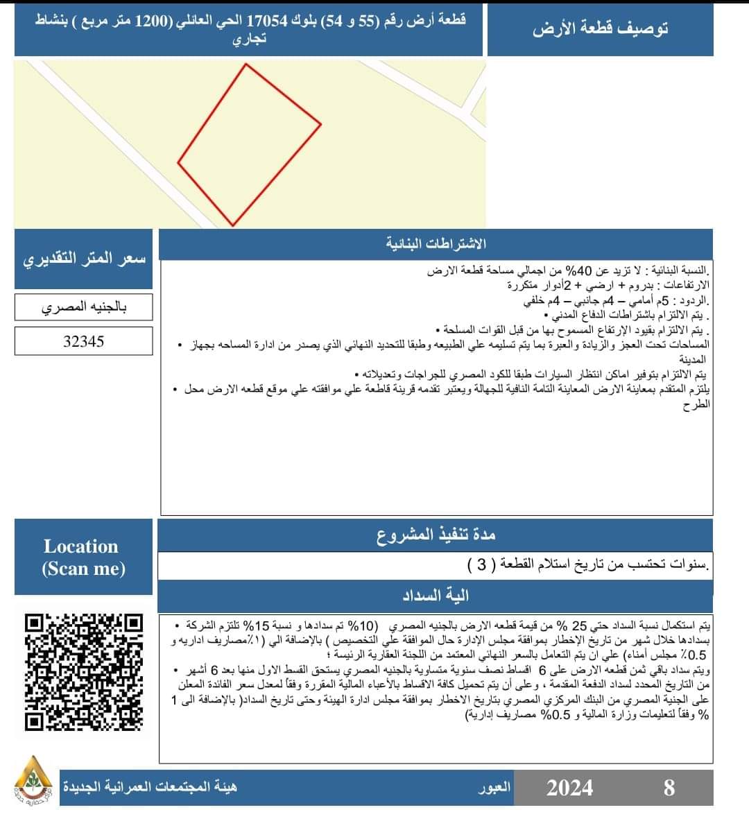 وأكد المهندس أحمد رشاد رئيس جهاز تنمية مدينة العبور بأن قطع الأراضي المقترحة للاستثمار لهذا الشهر عدد (٤) قطع بمساحات مختلفة، وانشطة متنوعة بنظام التخصيص المباشر بأنشطة متنوعة (تجاري، تجاري سكني، نادي اجتماعي).