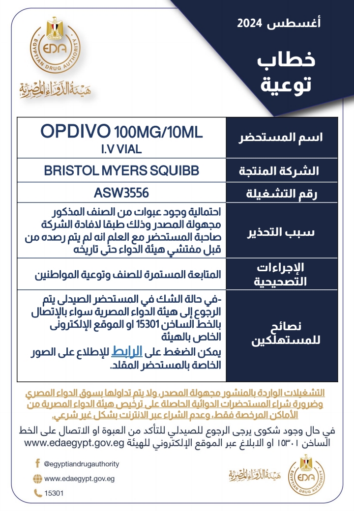 أصدرت هيئة الدواء المصرية خطاب توعية جديد تحذر فيه من احتمالية وجود عبوات مهربة من عقار OPDIVO 100MG/10ML I.V VIAL، والذي يستخدم في علاج السرطان.