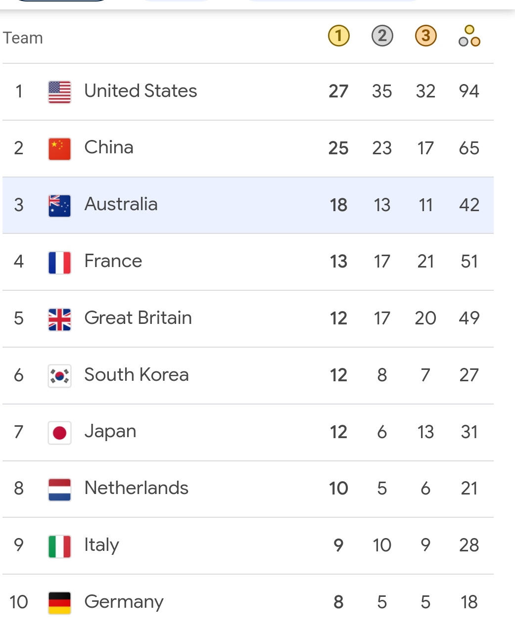 بينما تتصدر الولايات المتحدة القائمة بـ 27 ذهبية، بينما تأتي الصين في الوصافة بـ 25 ذهبية.