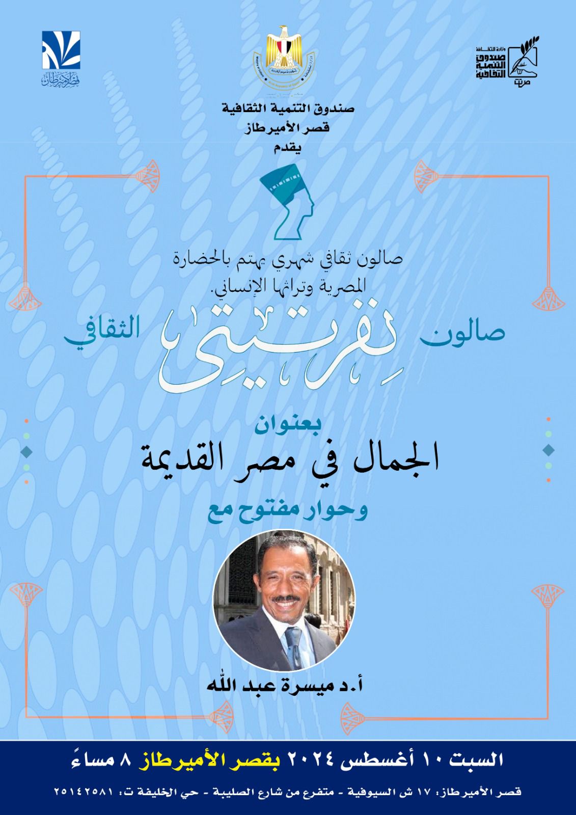 يقيم قطاع صندوق التنمية الثقافية برئاسة الدكتور وليد قانوش، تحت رعاية الدكتور أحمد فؤاد هنو وزير الثقافة، أمسية جديدة من أمسيات صالون "نفرتيتي" الثقافي بقصر الأمير طاز بالخليفة في الثامنة مساء السبت المقبل الموافق ١٠ أغسطس الجاري.