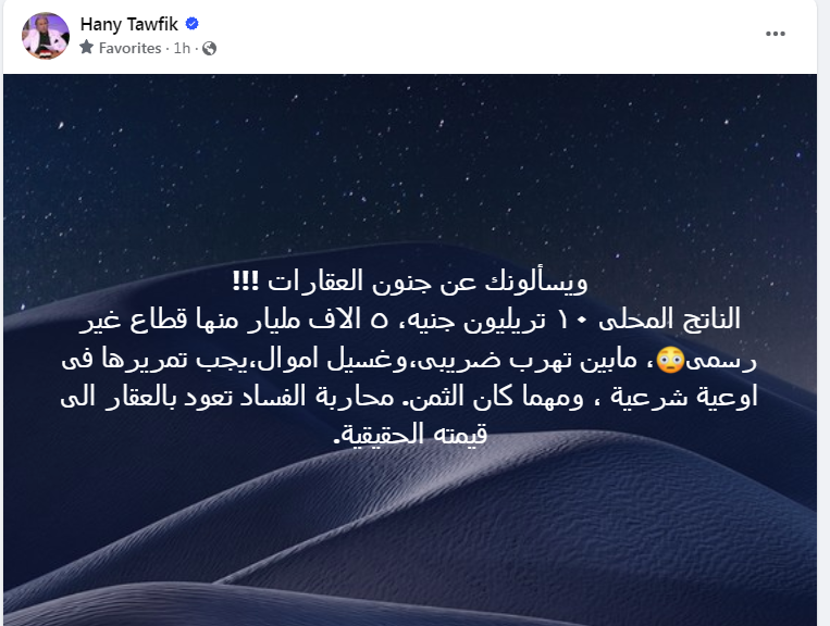 وقال الخبير الاقتصادي هاني توفيق عن أسعار العقارات: " ويسألونك عن جنون العقارات! الناتج المحلى ١٠ تريليونات جنيه، ٥ آلاف مليار منها قطاع غير رسمى، مابين تهرب ضريبى، وغسيل أموال، يجب تمريرها فى اوعية شرعية، ومهما كان الثمن. محاربة الفساد تعود بالعقار إلى قيمته الحقيقية."