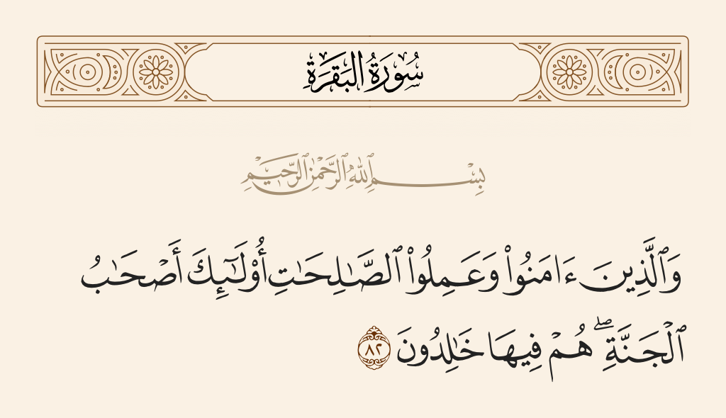 قال تعالى: «وَالَّذِينَ آمَنُوا وَعَمِلُوا الصَّالِحَاتِ أُولَئِكَ أَصْحَابُ الْجَنَّةِ هُمْ فِيهَا خَالِدُونَ».