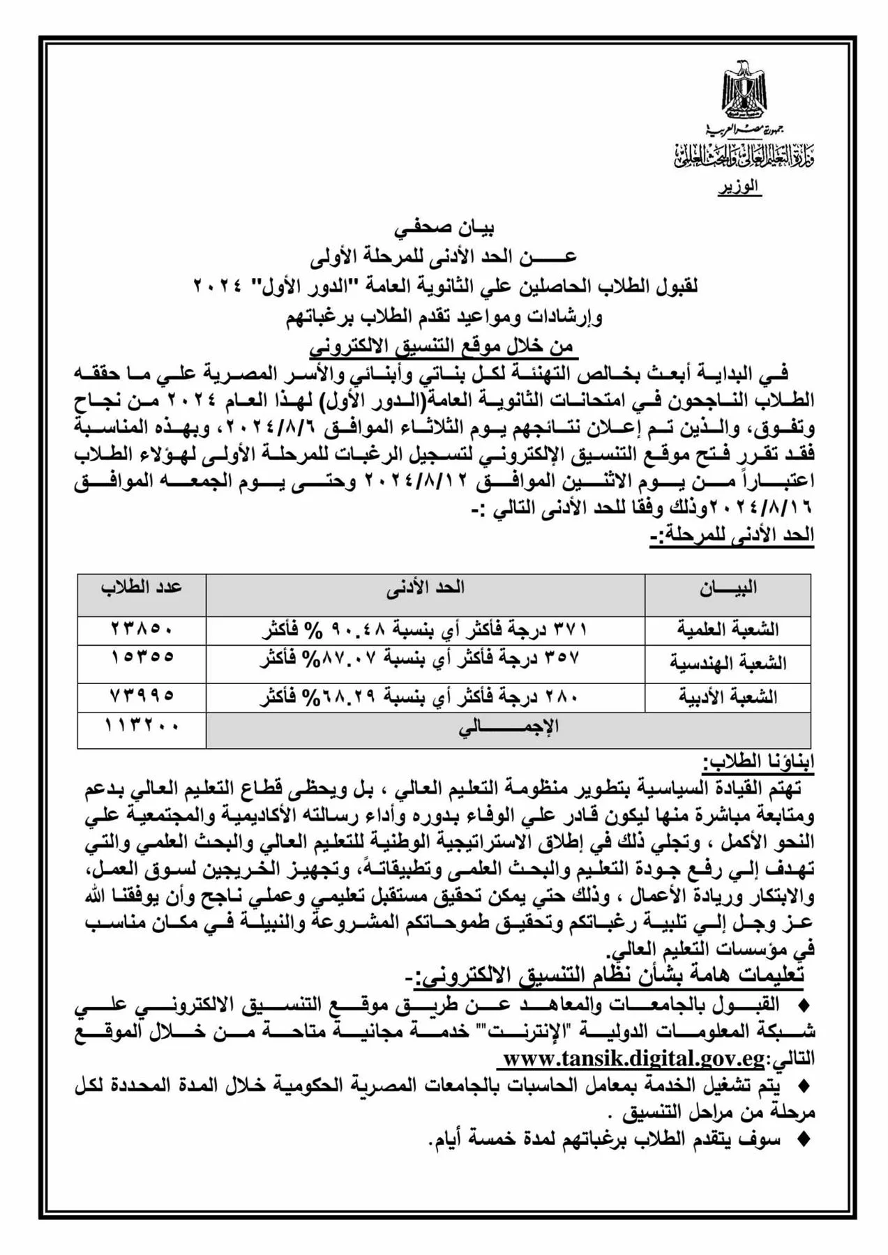 تنسيق الجامعات 2024، كشف مصدر بالتعليم العالي لفيتو أنه من المتوقع ارتفاع الحد الأدنى للقبول بكليات الشعب العلمية بنسبة تتراوح من 1 إلى 2% عن تنسيق العام الماضي وذلك بعد أن أعلنت وزارة التعليم العالي، الحد الادني المرحلة الأولى من تنسيق الجامعات علمي علوم 90,48%، والأدبي 68,29% وعلمي رياضة 87,07%.