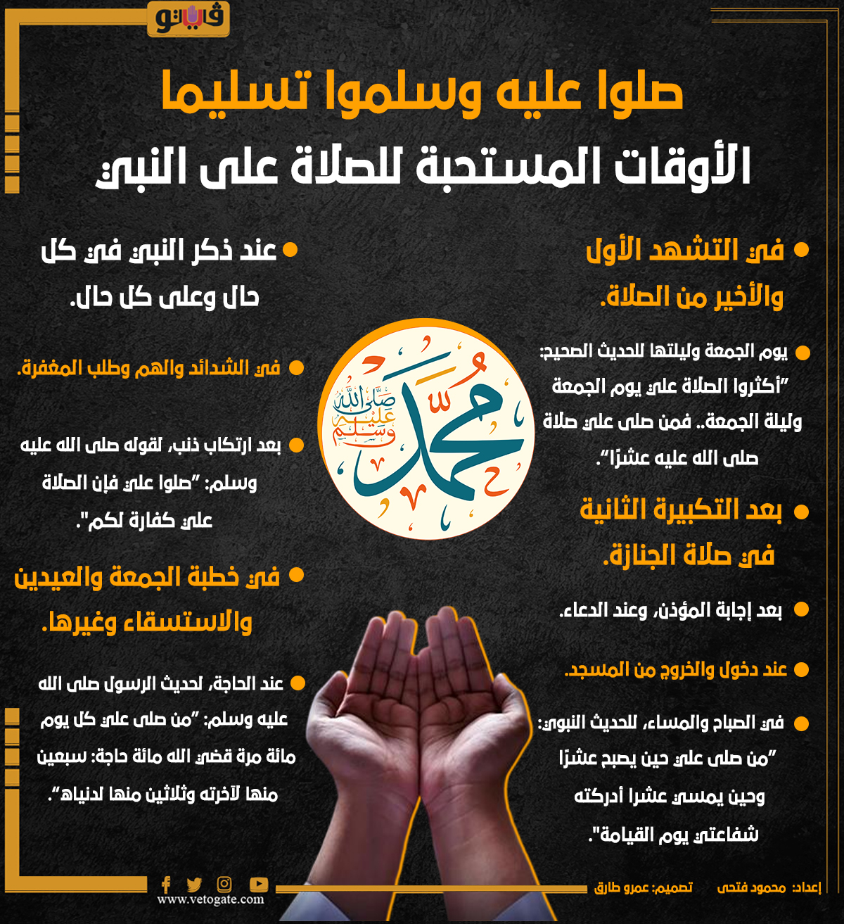 صلوا عليه وسلموا تسليما.. الأوقات المستحبة للصلاة على النبي (إنفوجراف) الجمعة 09/أغسطس/2024 - 10:29 ص 8/9/2024 10:29:38 AM الأوقات المستحبة للصلاة على النبي،فيتو محمود فتحى تصميم :عمرو طارق شارك طباعة 18 حجم الخط شارك طباعة