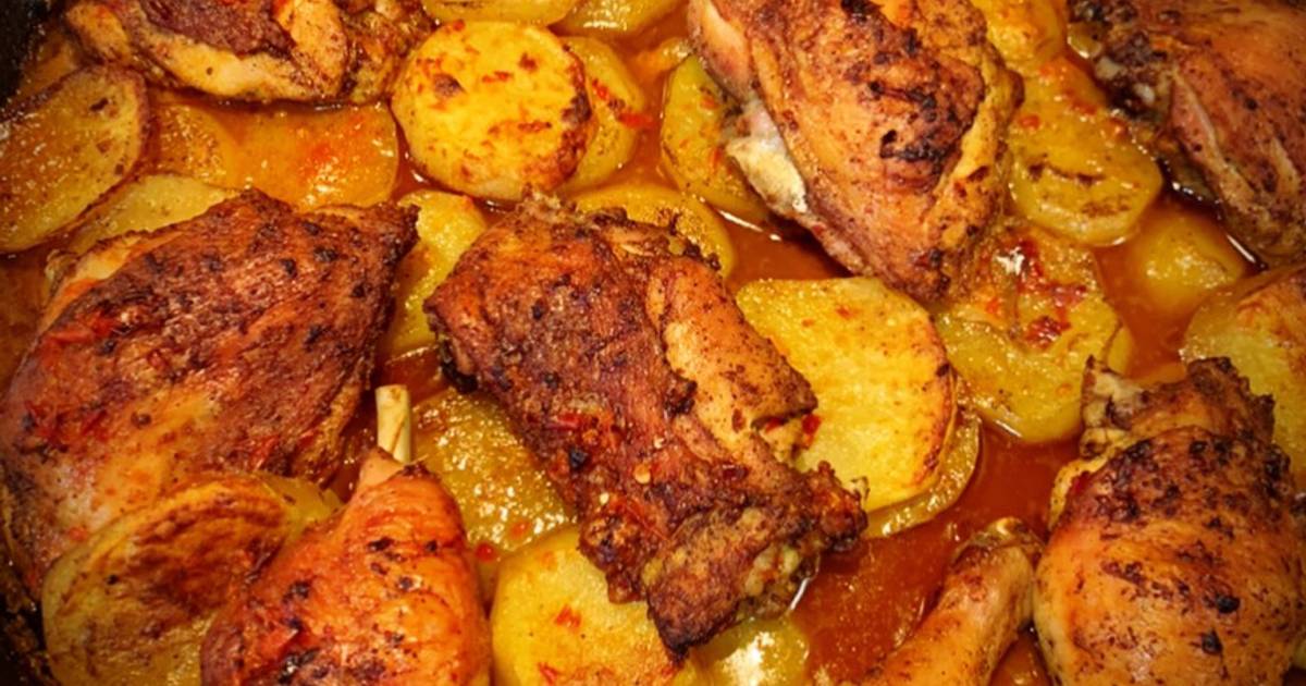 - ثم قلبي الدجاج والبطاطس مع إبقاء جلد الدجاج إلى الأعلى.