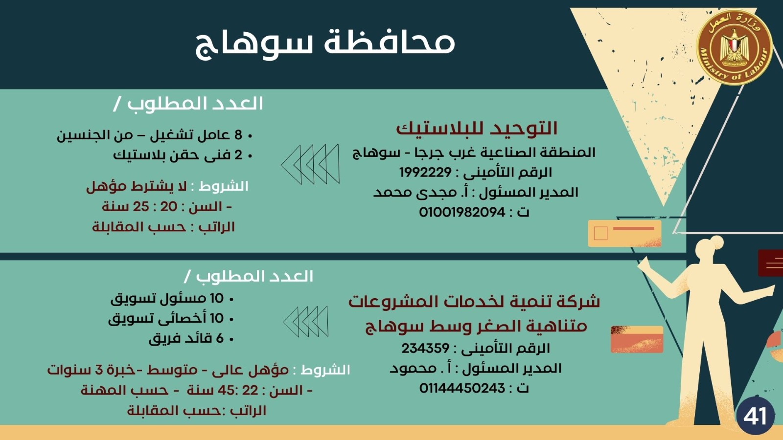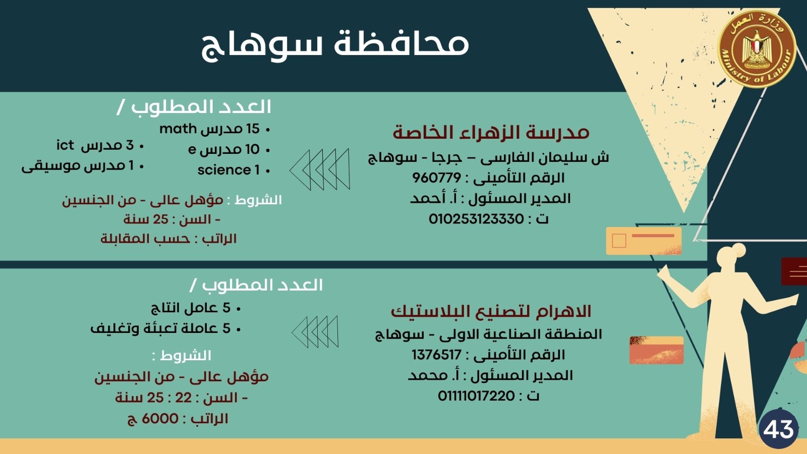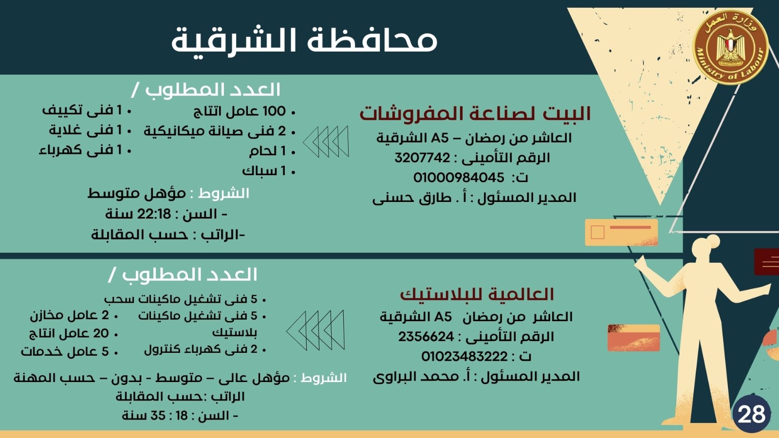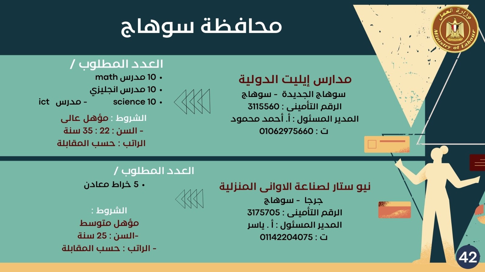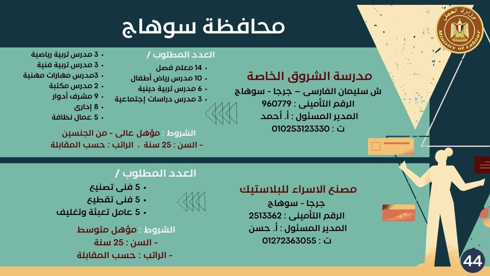 وفي تخصصات: مدرسين جميع التخصصات، ومسئول إئتمان، ومحاسبين، ومترجم صيني، أخصائي مكتبات، وقائد فريق، ومحصل، وموظفين استقبال فرع، وبائعين، وتلى سيلز، وخدمة عملاء، وأخصائي موارد بشرية، ومدير قسم جودة، ومدير إنتاج، وأخصائى تمريض، ومتخصص تسويق، ومشرف خطوط إنتاج، ومنسقين ميدانيين، وأخصائي تمويل، وأمين مخازن، ومهندسين كهرباء وميكانيكا، وإنتاج وجودة وفلزات، وسكرتارية، وأعمال إدارية، وسائقين رخصة أولى وثانية وثالثة، ومندوبين مبيعات، ومراقبين جودة، وفنيين جميع التخصصات، ومشرفي إنتاج، وأفراد أمن، وعمال خياطة بكافة الأقسام،وعمال انتاج، وعمال نظافة، وتخصصات أخرى.
