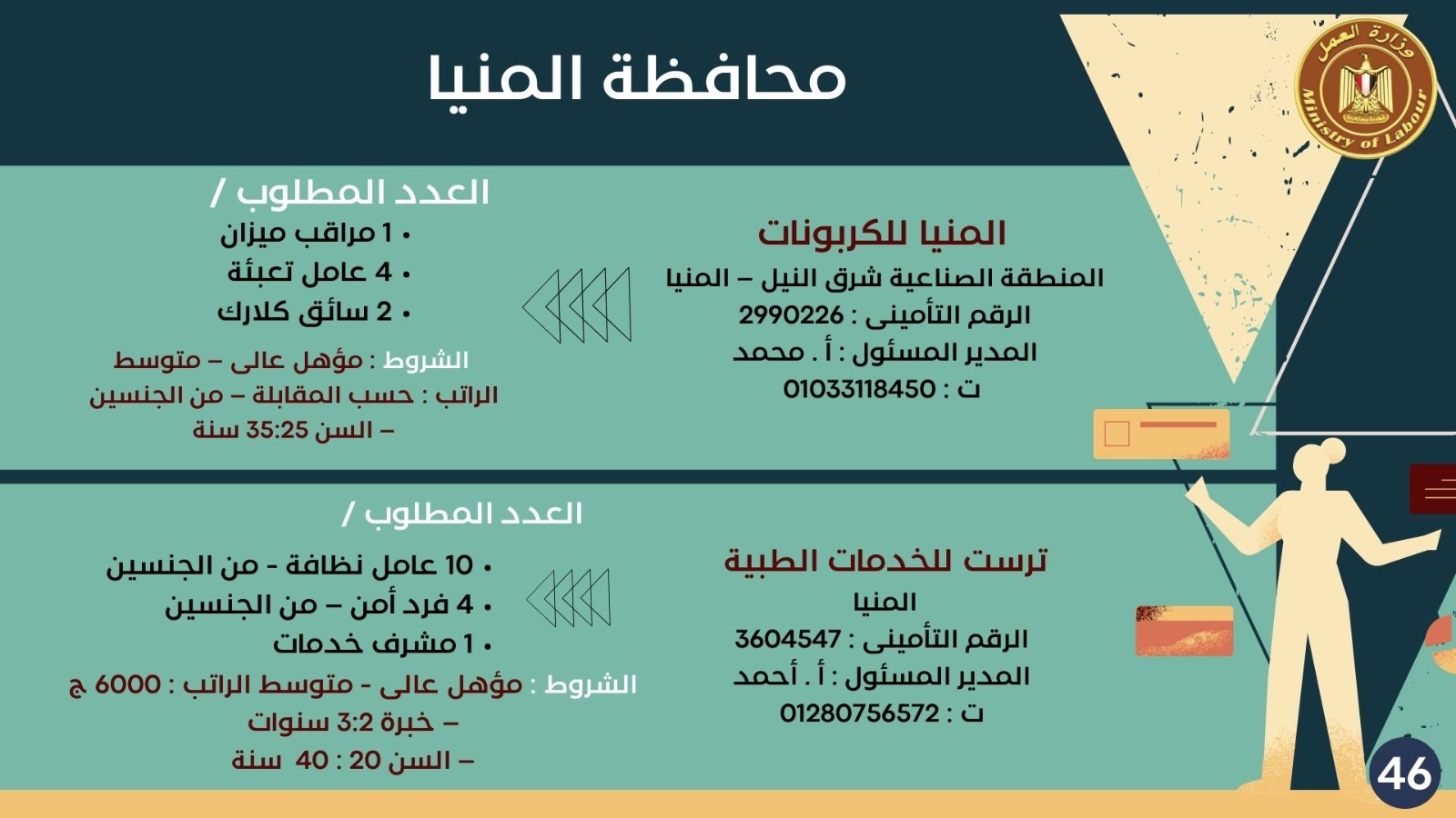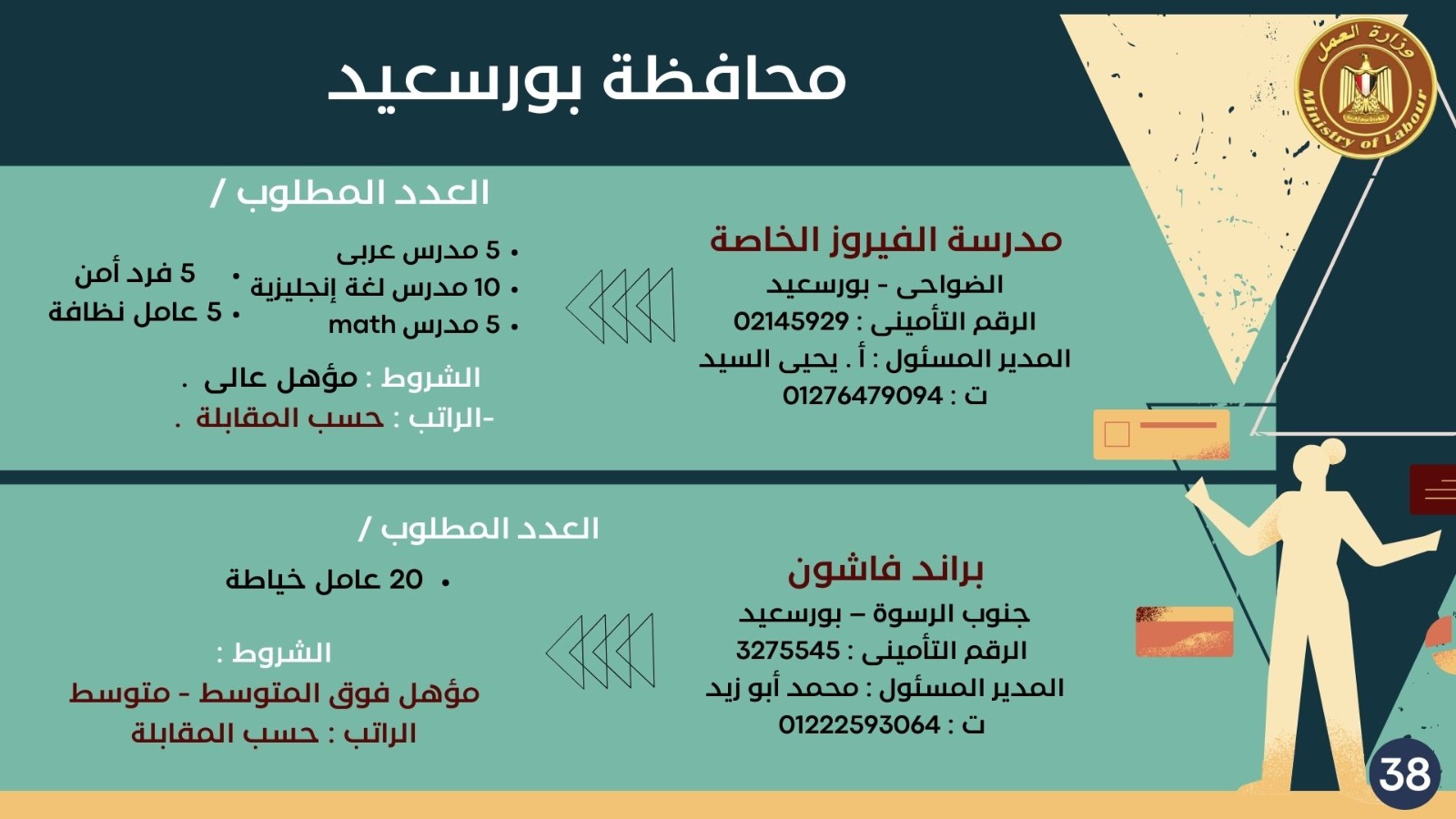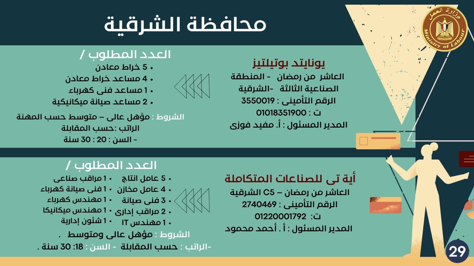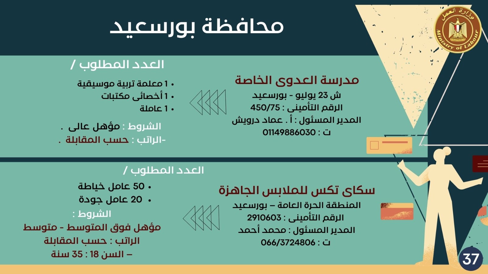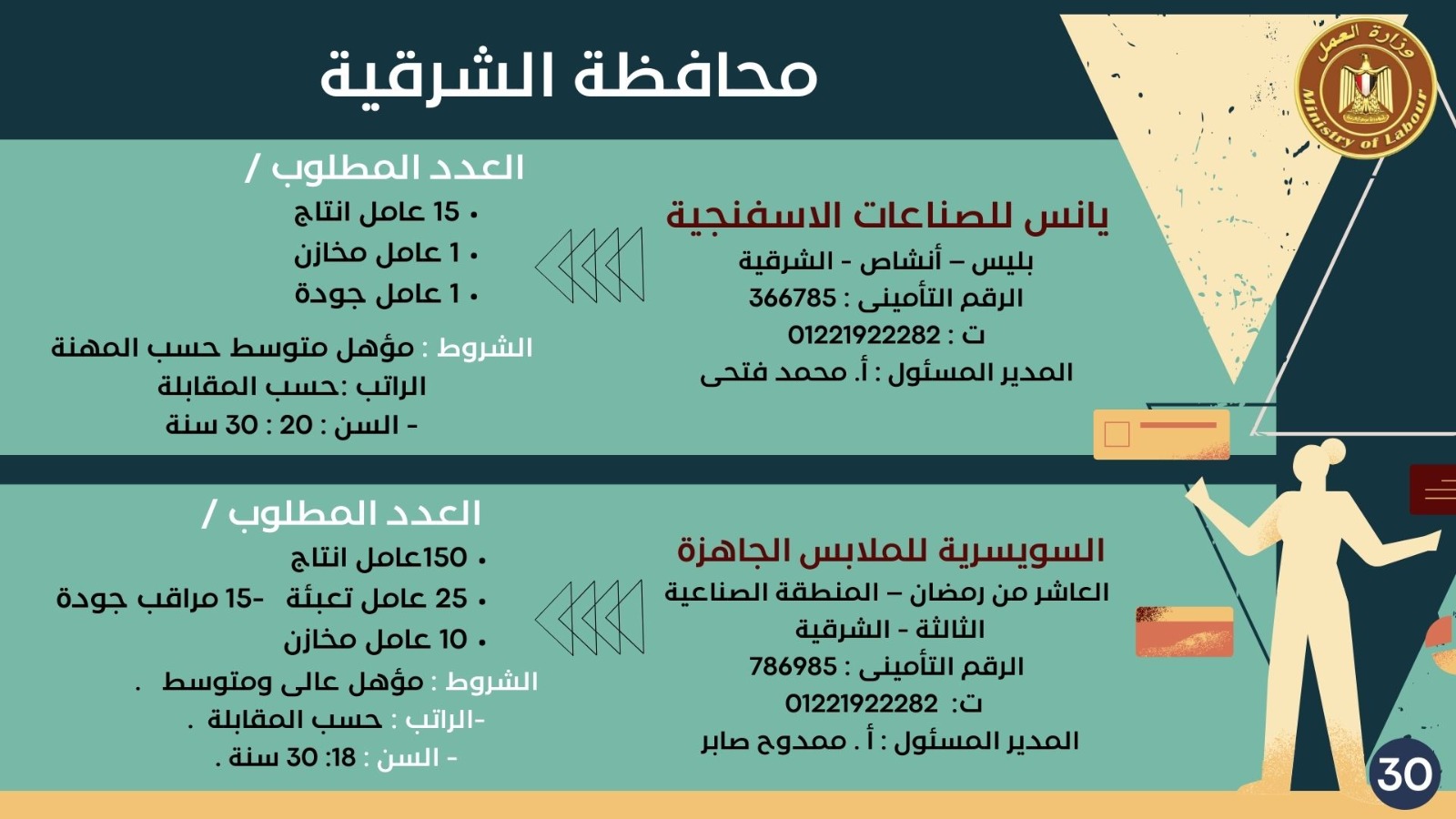 وفي تخصصات: مدرسين جميع التخصصات، ومسئول إئتمان، ومحاسبين، ومترجم صيني، أخصائي مكتبات، وقائد فريق، ومحصل، وموظفين استقبال فرع، وبائعين، وتلى سيلز، وخدمة عملاء، وأخصائي موارد بشرية، ومدير قسم جودة، ومدير إنتاج، وأخصائى تمريض، ومتخصص تسويق، ومشرف خطوط إنتاج، ومنسقين ميدانيين، وأخصائي تمويل، وأمين مخازن، ومهندسين كهرباء وميكانيكا، وإنتاج وجودة وفلزات، وسكرتارية، وأعمال إدارية، وسائقين رخصة أولى وثانية وثالثة، ومندوبين مبيعات، ومراقبين جودة، وفنيين جميع التخصصات، ومشرفي إنتاج، وأفراد أمن، وعمال خياطة بكافة الأقسام،وعمال انتاج، وعمال نظافة، وتخصصات أخرى.