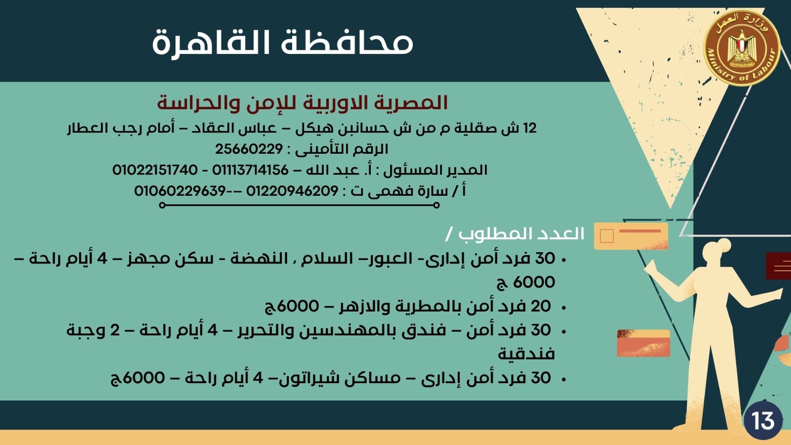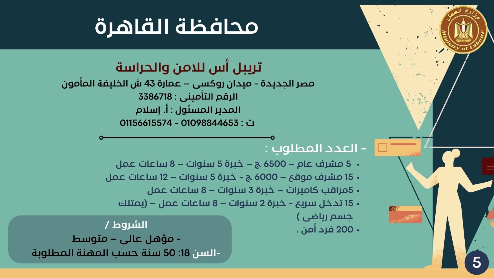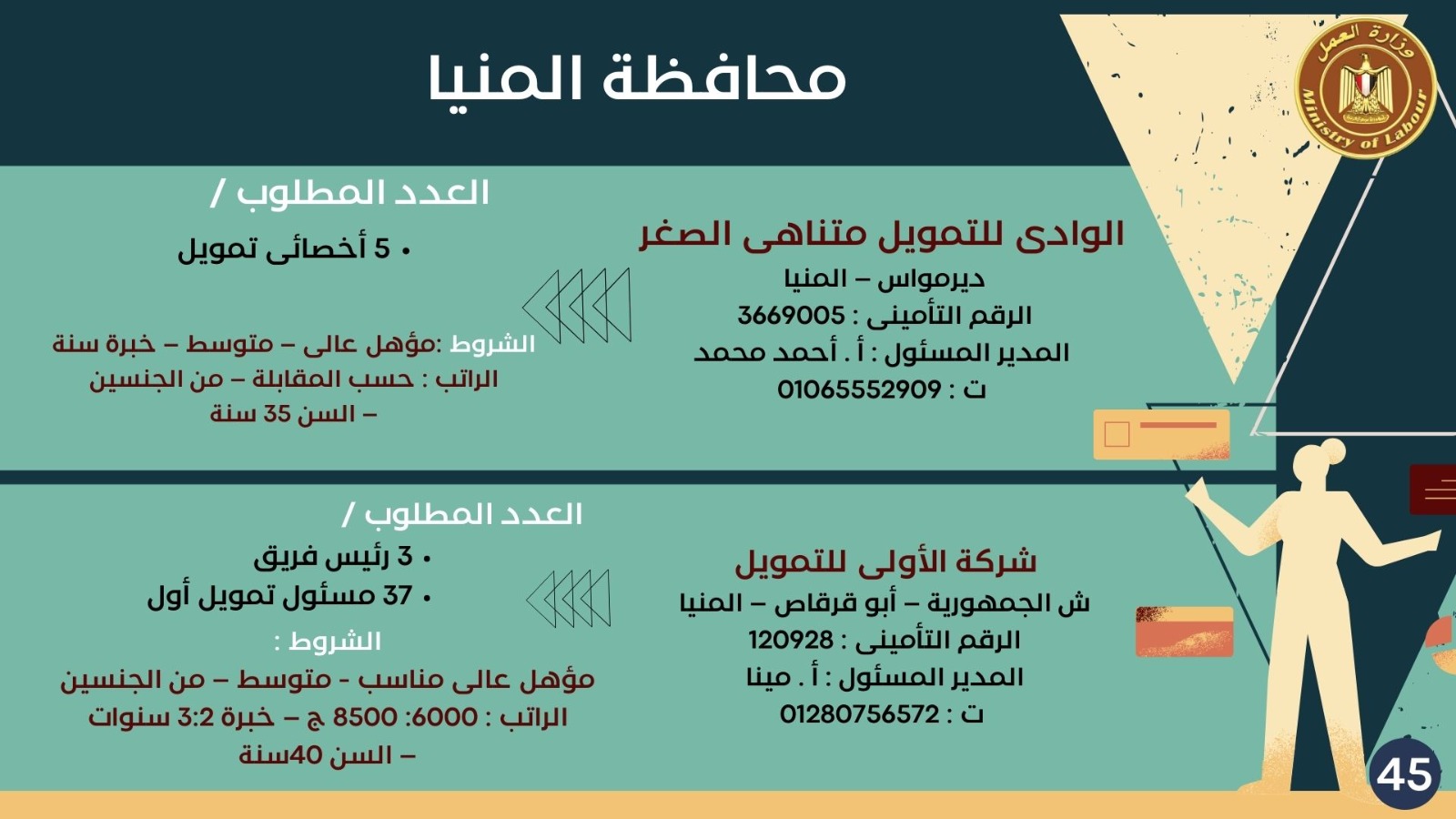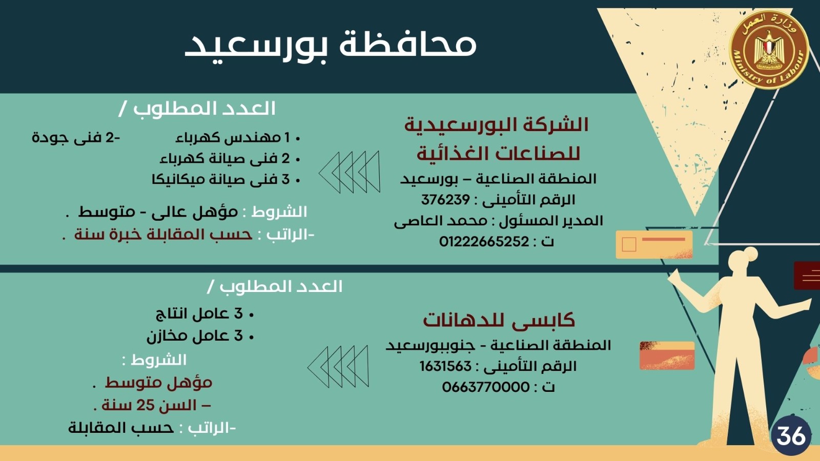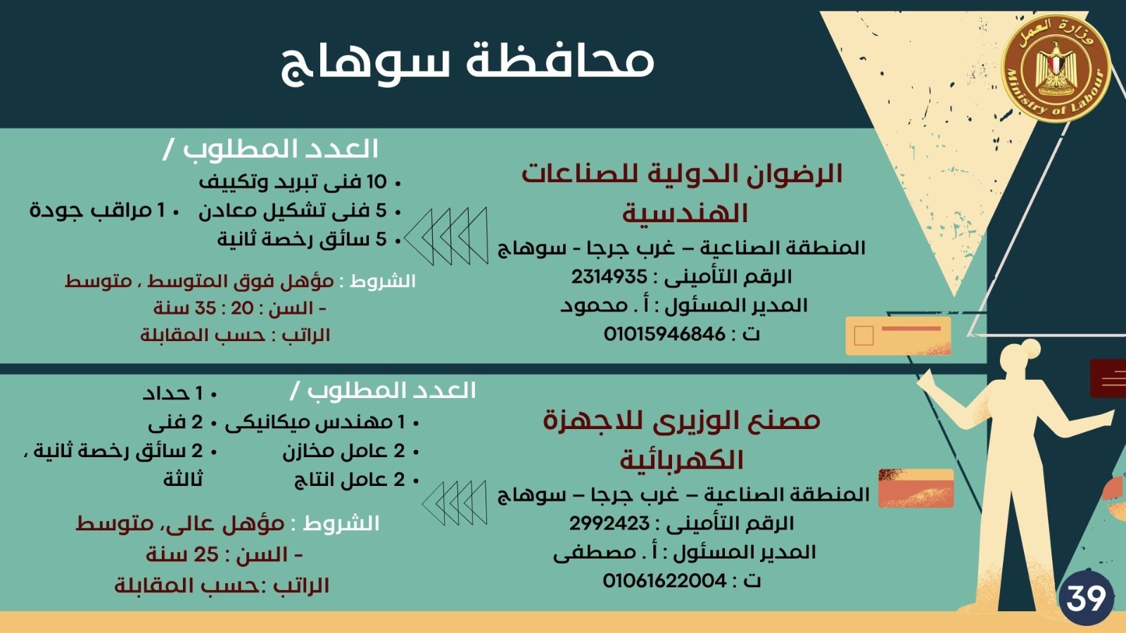 وفي تخصصات: مدرسين جميع التخصصات، ومسئول إئتمان، ومحاسبين، ومترجم صيني، أخصائي مكتبات، وقائد فريق، ومحصل، وموظفين استقبال فرع، وبائعين، وتلى سيلز، وخدمة عملاء، وأخصائي موارد بشرية، ومدير قسم جودة، ومدير إنتاج، وأخصائى تمريض، ومتخصص تسويق، ومشرف خطوط إنتاج، ومنسقين ميدانيين، وأخصائي تمويل، وأمين مخازن، ومهندسين كهرباء وميكانيكا، وإنتاج وجودة وفلزات، وسكرتارية، وأعمال إدارية، وسائقين رخصة أولى وثانية وثالثة، ومندوبين مبيعات، ومراقبين جودة، وفنيين جميع التخصصات، ومشرفي إنتاج، وأفراد أمن، وعمال خياطة بكافة الأقسام،وعمال انتاج، وعمال نظافة، وتخصصات أخرى.