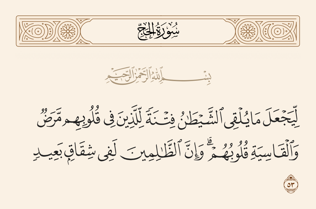 قال تعالى: «لِيَجْعَلَ مَا يُلْقِي الشَّيْطَانُ فِتْنَةً لِلَّذِينَ فِي قُلُوبِهِمْ مَرَضٌ وَالْقَاسِيَةِ قُلُوبُهُمْ وَإِنَّ الظَّالِمِينَ لَفِي شِقَاقٍ بَعِيدٍ».