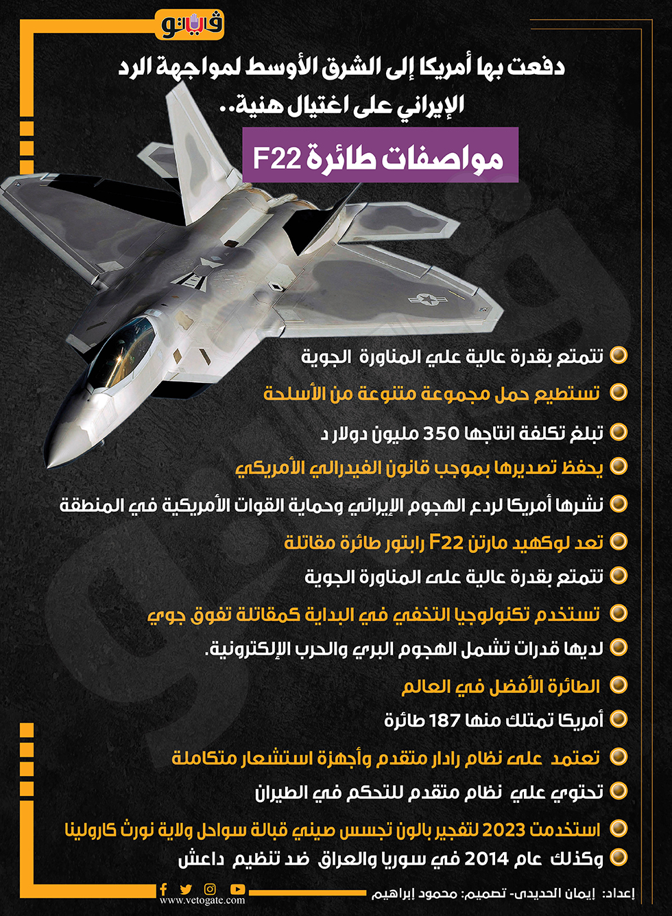 دفعت بها أمريكا إلى الشرق الأوسط لمواجهة الرد الإيراني على اغتيال هنية.. مواصفات طائرة F22 (إنفوجراف) السبت 10/أغسطس/2024 - 05:31 م 8/10/2024 5:31:25 PM طائرات F22، فيتو إيمان الحديدى شارك طباعة 18 حجم الخط شارك طباعة الرد الإيراني على اغتيال هنية القوات الأمريكية في المنطقة الفيدرالى الامريكى القوات الأمريكية إيران حماية القوات الأمريكية طائرات F22 المتقدمة