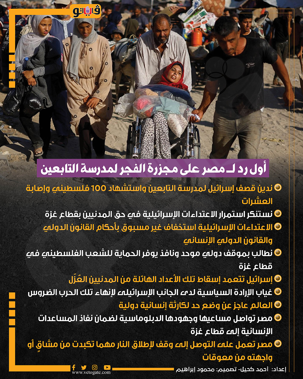 أول رد لـ مصر على مجزرة الفجر لمدرسة التابعين (إنفوجراف) السبت 10/أغسطس/2024 - 12:56 م 8/10/2024 12:56:47 PM غزة، فيتو أحمد كحيل شارك طباعة 18 حجم الخط شارك طباعة مدرسة التابعين استشهاد 100 فلسطيني الاعتداءات الاسرائيلية الحماية للشعب الفلسطيني كارثة إنسانية دولية الحرب الضروس المساعدات الانسانية