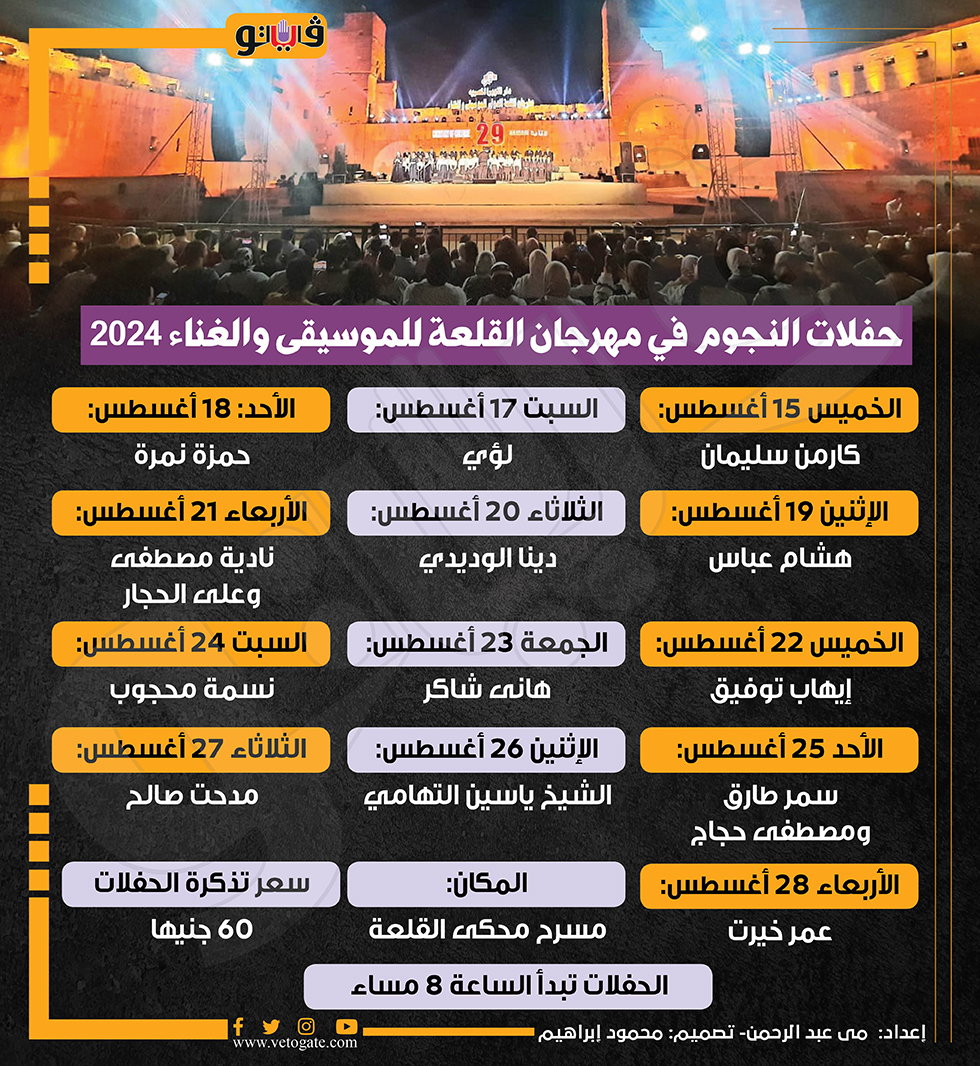 حفلات النجوم في مهرجان القلعة للموسيقى والغناء 2024 (إنفوجراف) السبت 10/أغسطس/2024 - 04:14 م 8/10/2024 4:14:38 PM مهرجان القلعة،فيتو مى عبد الرحمن شارك طباعة 18 حجم الخط شارك طباعة مهرجان القلعة للموسيقى مهرجان القلعة للموسيقى والغناء مهرجان القلعة كارمن سليمان علي الحجار دينا الوديدي هاني شاكر القلعة للموسيقى والغناء القلعة للموسيقى الشيخ ياسين التهامي