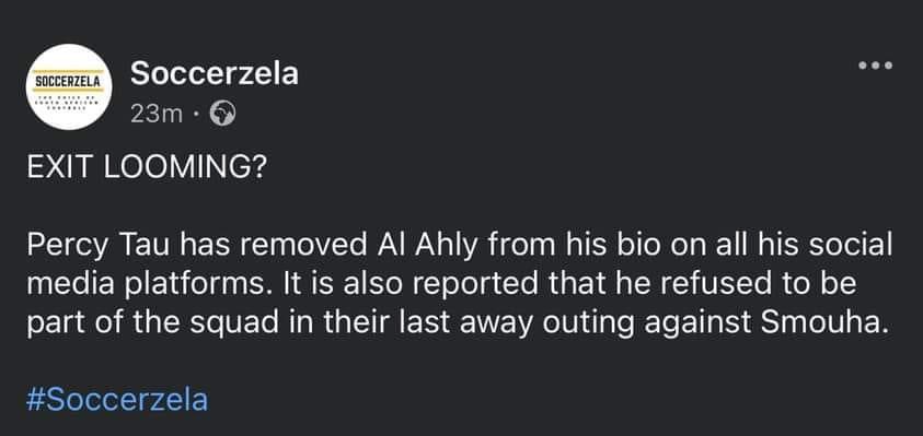 الأهلي، كشف موقع Soccerzela الجنوب أفريقي، أن بيرسي تاو لاعب النادي الأهلي، أزال اسم فريق الأهلي من سيرته الذاتية على جميع منصاته على وسائل التواصل الاجتماعي.