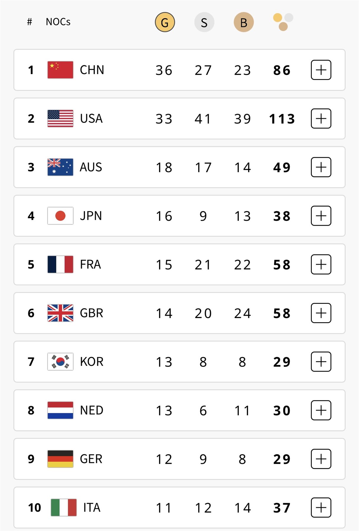 أولمبياد باريس، وسعت الصين الفارق مع الولايات المتحدة الأمريكية إلى 3 ميداليات ذهبية لتواصل الانفراد بصدارة الترتيب العام للميداليات في أولمبياد باريس، برصيد 36 ميدالية ذهبية.
