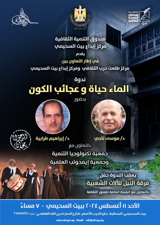 يقيم قطاع صندوق التنمية الثقافية، برئاسة الدكتور وليد قانوش، بمركز إبداع بيت السحيمي بشارع المعز، بالتعاون مع مركز إبداع طلعت حرب التابع للصندوق، ندوة جديدة بعنوان "الماء حياة وعجائب الكون"، في السابعة مساء غدًا الأحد الموافق 11 أغسطس الجاري.