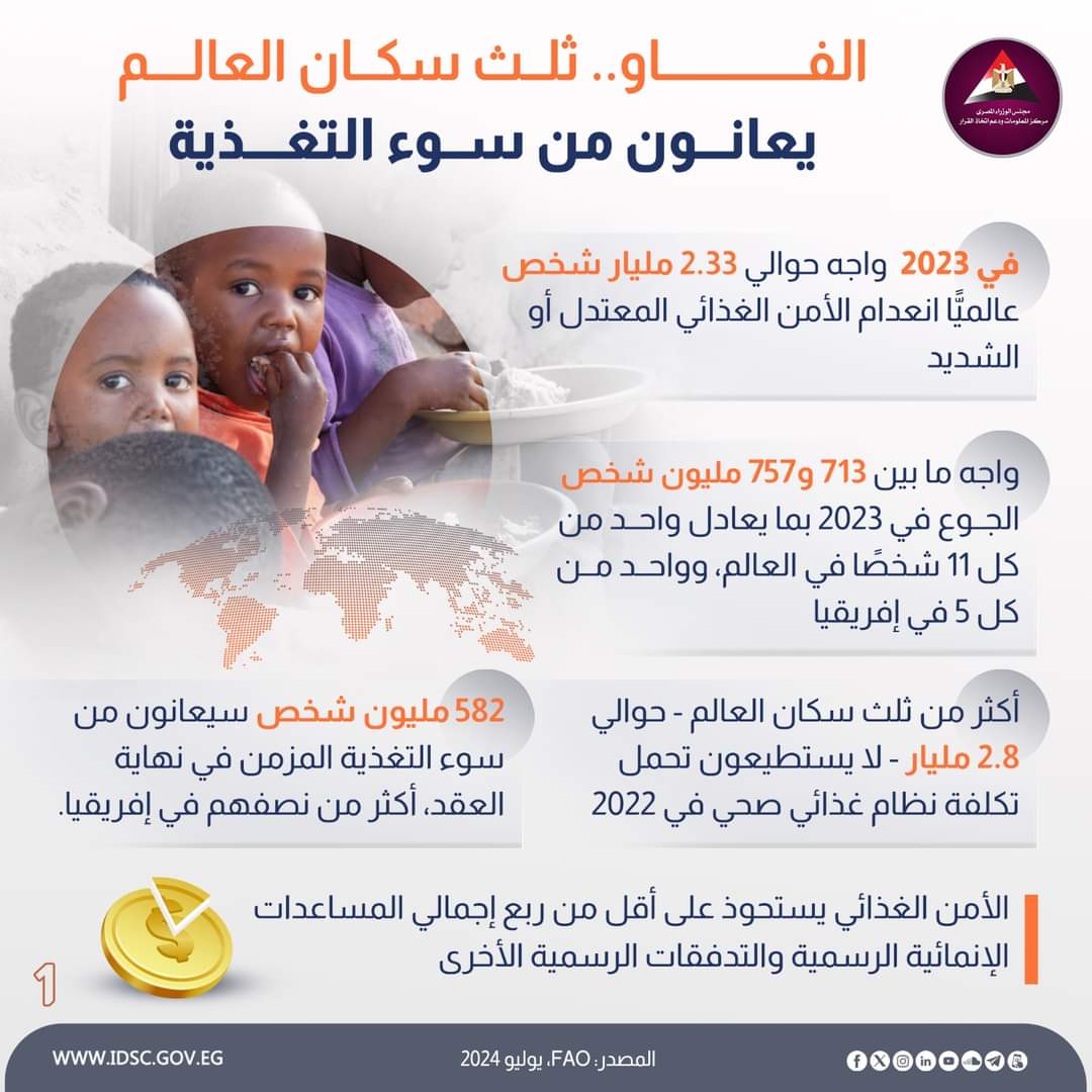 سلط مركز المعلومات ودعم اتخاذ القرار بمحلس الوزراء الضوء على تقرير منظمة الغذاء العالمي فاو الصادر في يوليو 2024،حيث كشف التقرير أن 2.8 مليار شخص أى ما يعادل ثلث سكان العالم يعانون من سوء التغذية