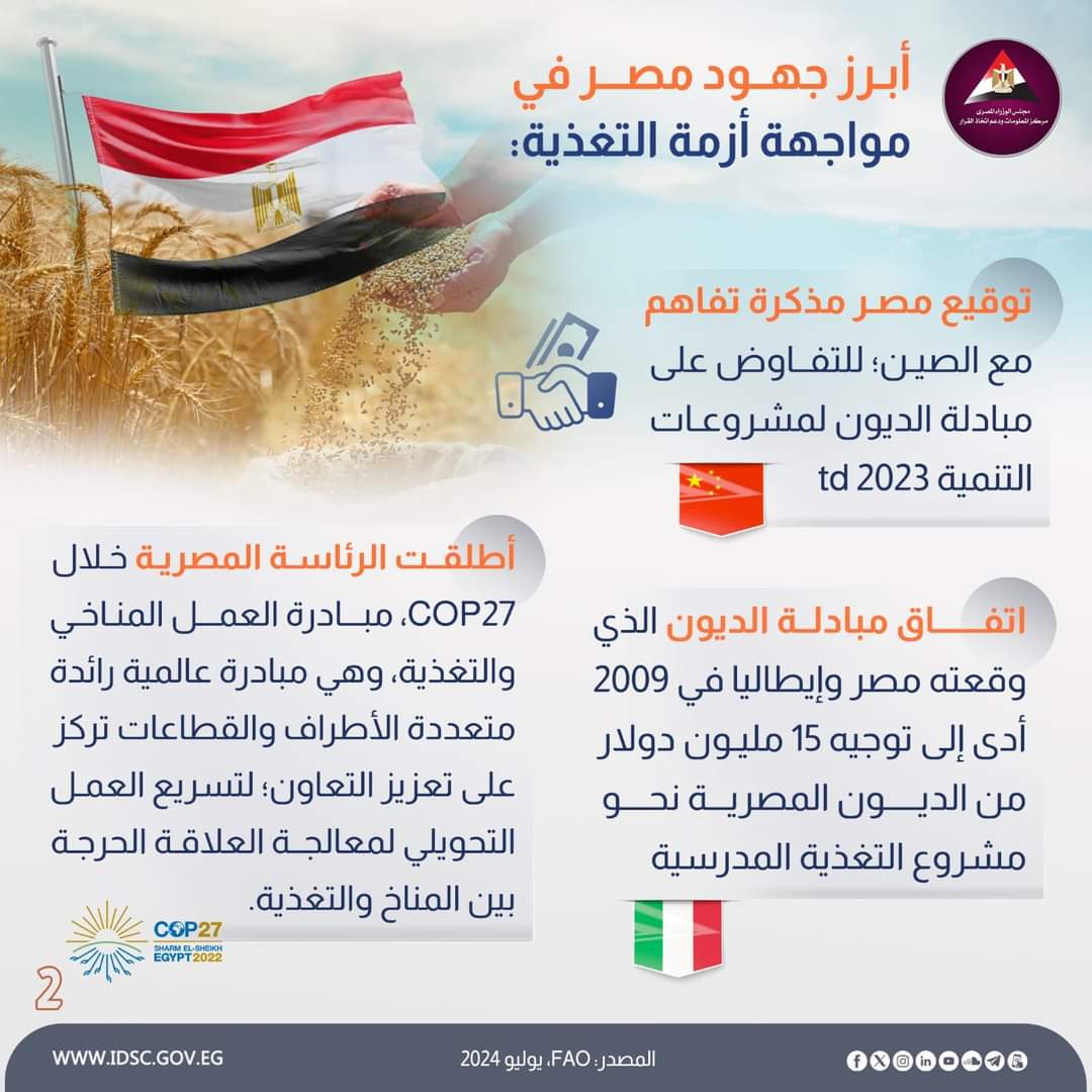 مصر أيضًا تبذل جهودًا كبيرة على المستوى المحلي من خلال مبادلات الديون التي توجه نحو مشاريع التغذية ومع ذلك، لا يزال هناك الكثير من العمل الذي يجب القيام به لتحقيق هدف القضاء على الجوع بحلول عام 2030.