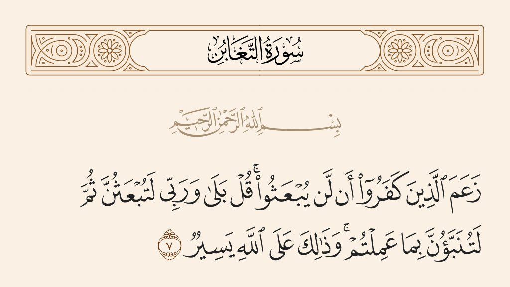 قال تعالى: «زَعَمَ الَّذِينَ كَفَرُوا أَنْ لَنْ يُبْعَثُوا قُلْ بَلى وَرَبِّي لَتُبْعَثُنَّ ثُمَّ لَتُنَبَّؤُنَّ بِما عَمِلْتُمْ وَذلِكَ عَلَى اللَّهِ يَسِيرٌ».