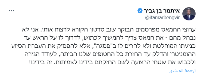 وتابع بن غفير حديثه المتطرف فقال: "يجب أن يستمر سحق حماس، والدوس على رأسها حتى تستسلم تمامًا، وألا يتم رفعها في "القمة"، بل يجب وقف نقل المساعدات الإنسانية والوقود حتى يعود جميع مختطفينا إلى ديارهم. تشجيع الهجرة واحتلال أراضي قطاع غزة من أجل إبقائها في أيدينا إلى الأبد. انها في أيدينا!"