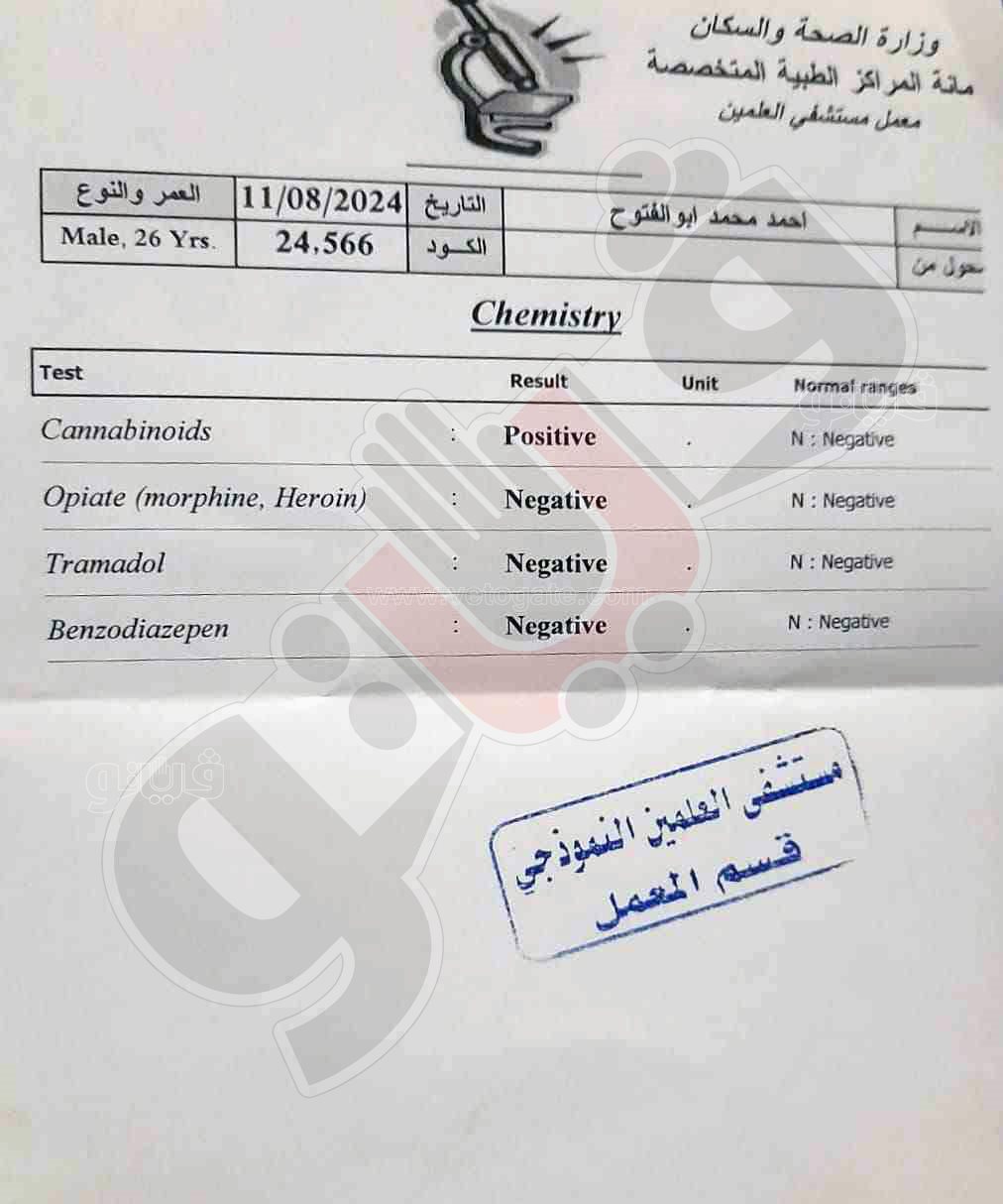 وحصلت "فيتو" على صورة تحليل المخدرات للاعب نادي الزمالك أحمد فتوح، المتورط في حادث سير بطريق العلمين، والذي أسفر عن مصرع أمين شرطة اليوم الأحد.