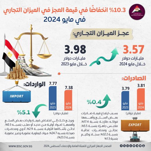 الوزراء: 10.3 % انخفاضا في قيمة العجز بالميزان التجاري خلال مايو 2024 (إنفوجراف)
