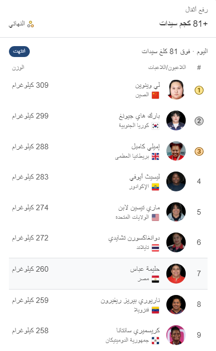 أولمبياد باريس، حليمة عباس تودع منافسات رفع الأثقال بعد احتلالها المركز السابع