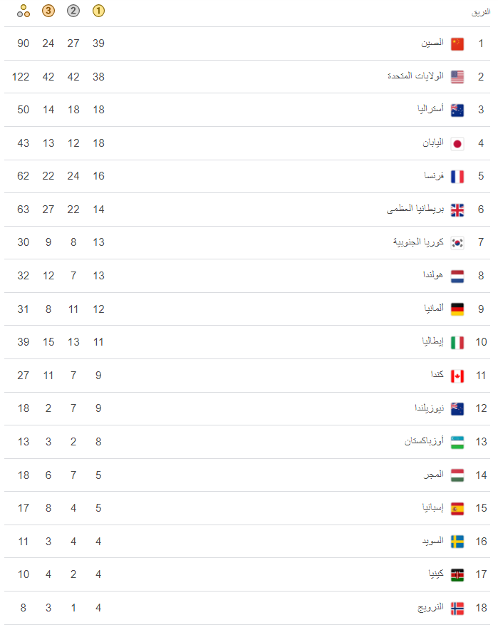 وحققت الصين 39 ميدالية ذهبية بفارق ميدالية واحدة عن أمريكا التي تتفوق في عدد الميداليات الإجمالية.