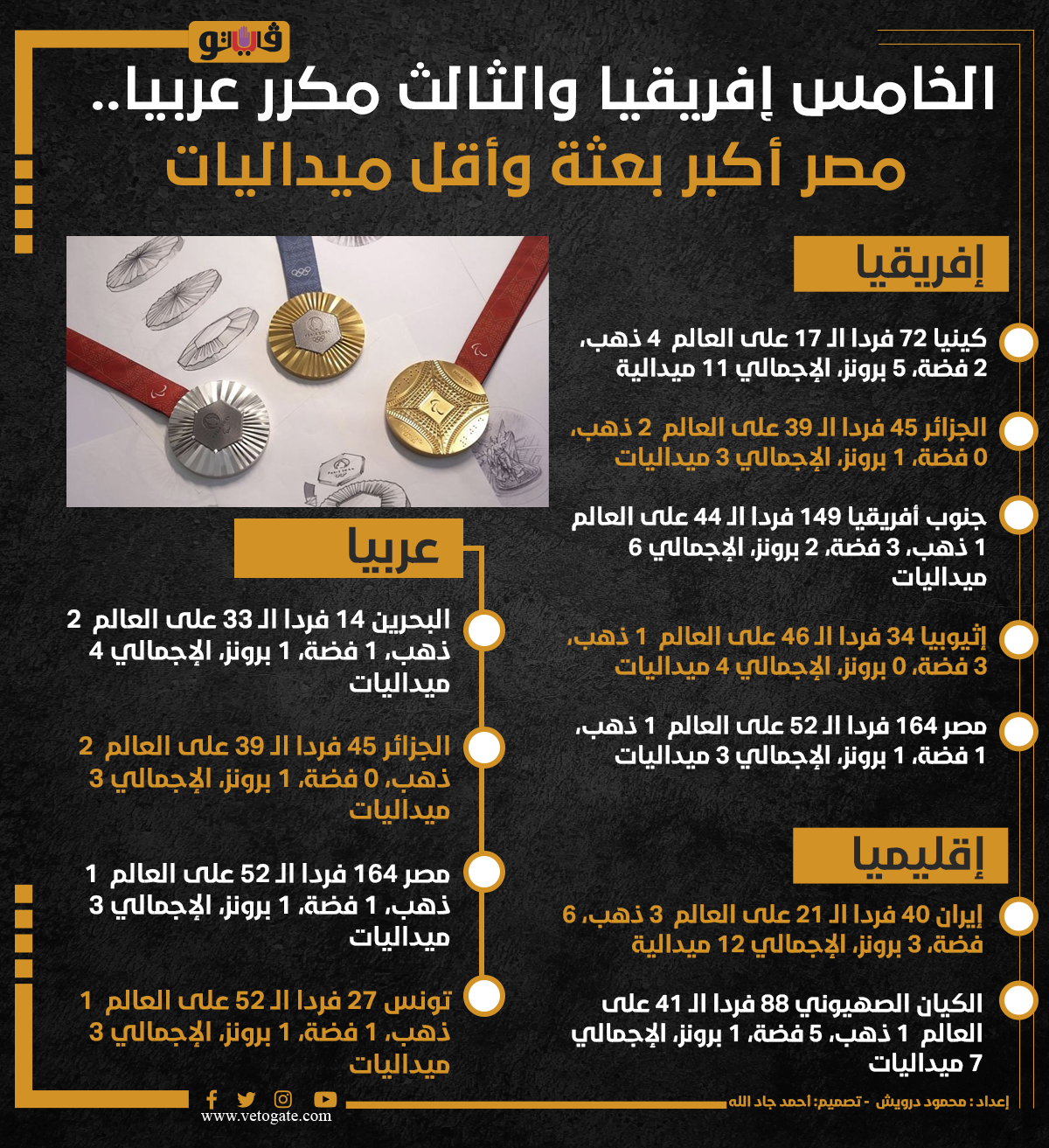 الخامس إفريقيا والثالث مكرر عربيا.. مصر أكبر بعثة وأقل ميداليات (إنفوجراف) الأربعاء 14/أغسطس/2024 - 12:25 م 8/14/2024 12:25:59 PM ميداليات محمود درويش شارك طباعة 18 حجم الخط شارك طباعة الأولمبياد بعثة مصر الجزائر مصر إيران البحرين