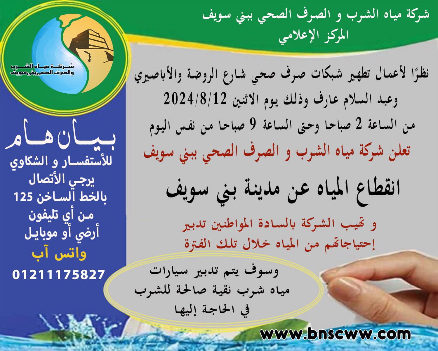 وأهابت شركة مياه الشرب ببني سويف، بالمواطنين تدبير إحتياجاتهم من المياه خلال تلك الفترة وسوف يتم تدبير سيارات مياه شرب نقية صالحة للشرب في الحاجة إليها للأستفسار والشكاوي يرجي الأتصال بالخط الساخن 125 أو رقم واتس آب 01211175827.