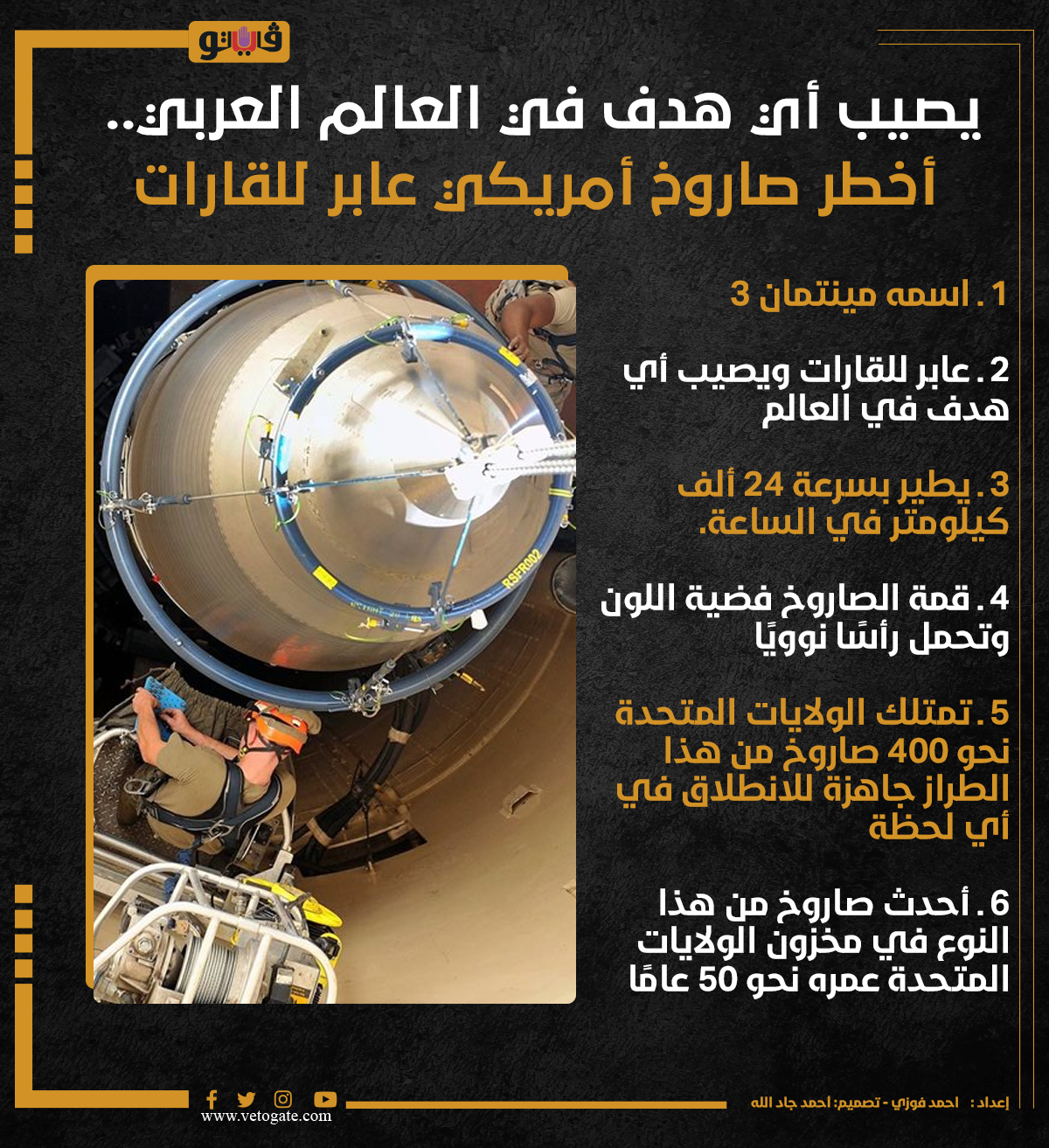 يصيب أي هدف في العالم العربي.. أخطر صاروخ أمريكي عابر للقارات (إنفوجراف) الخميس 15/أغسطس/2024 - 07:37 م 8/15/2024 7:37:29 PM مينتمان 3، فيتو احمد فوزي شارك طباعة 18 حجم الخط شارك طباعة مينتمان 3 الولايات المتحدة مخزون الولايات المتحدة صاروخ أمريكي قمة الصاروخ
