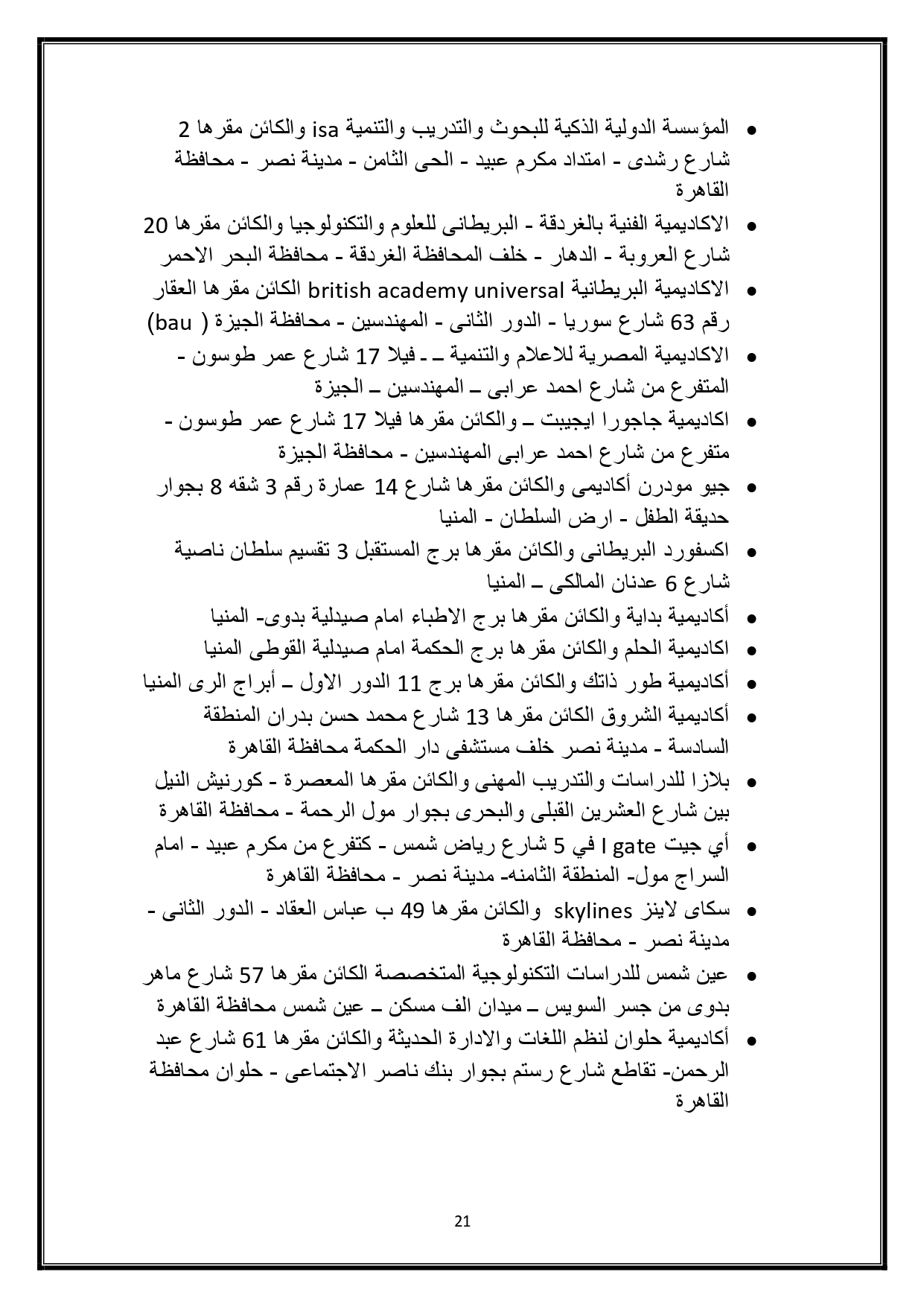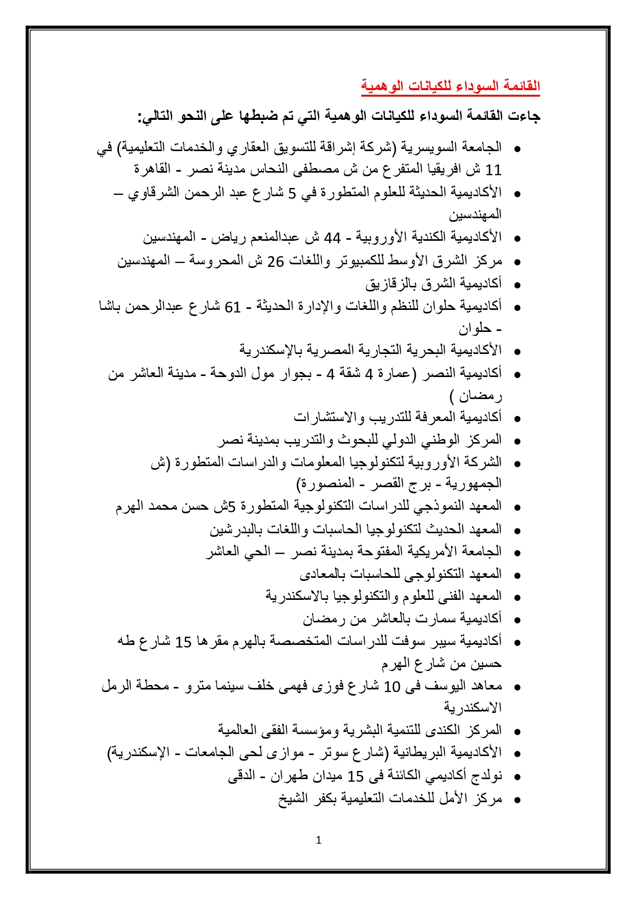 ونشرت الوزارة القائمة السوداء للكيانات الوهمية عبر موقع وزارة التعليم العالي وصفحاتها الرسمية على مواقع التواصل الاجتماعي التالية: