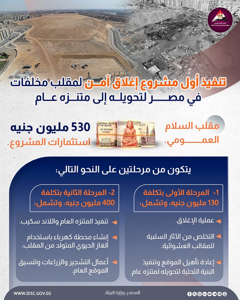 كشف مركز المعلومات ودعم اتخاذ القرار بمجلس الوزراء عن تفاصيل تنفيذ أول مشروع إغلاق آمن لمقلب مخلفات في مصر وتحويله إلى متنزه عام بمدينة السلام باستثمارات تبلغ 530 مليون جنيه.