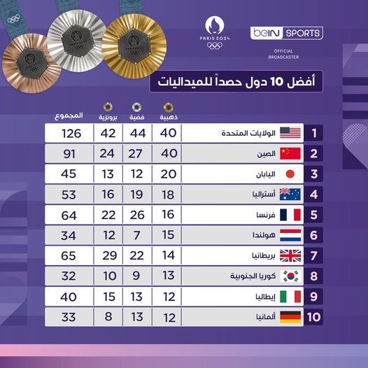 أولمبياد باريس، حسمت الولايات المتحدة الأمريكية لصالحها، صراع صدارة جدول ترتيب الميداليات في دورة الألعاب الأولمبية باريس 2024، مع الصين.