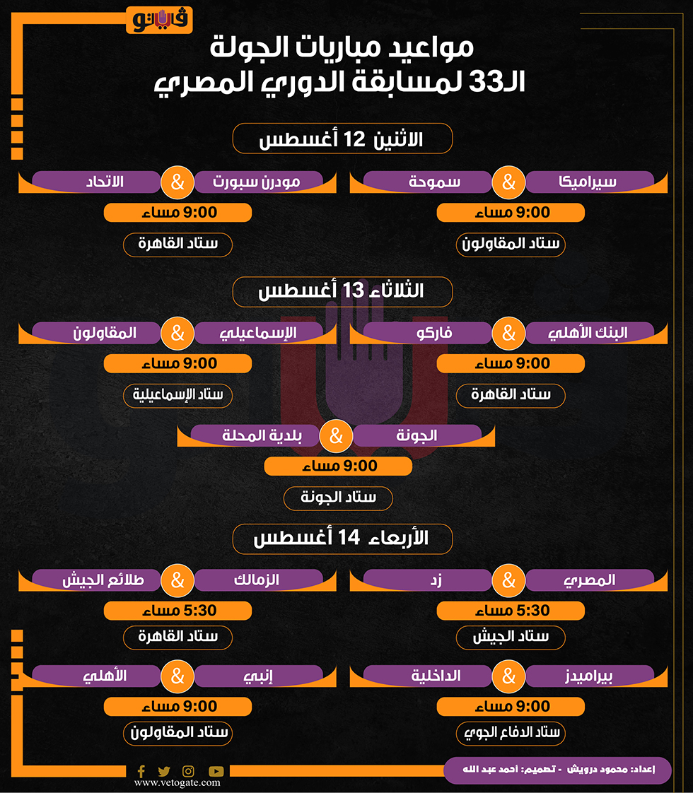 مواعيد مباريات الجولة الـ33 لمسابقة الدوري المصري (إنفوجراف) الإثنين 12/أغسطس/2024 - 12:12 م 8/12/2024 12:12:15 PM الدوري المصري محمود درويش شارك طباعة 18 حجم الخط شارك طباعة الدورى المصرى الممتاز الدوري المصري انبي ضد الاهلي الزمالك ضد طلائع الجيش الزمالك الأهلي