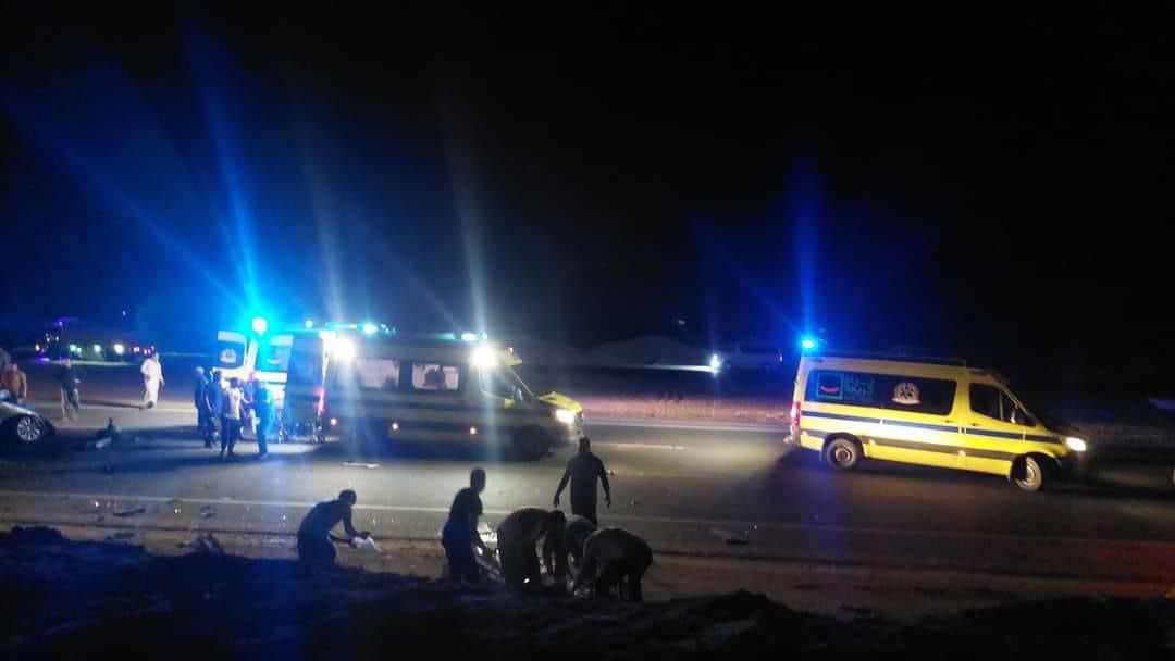 بينهم مطرب شهير، مصرع شخصين وإصابة 12 في تصادم سيارتين بأسوان (صور)