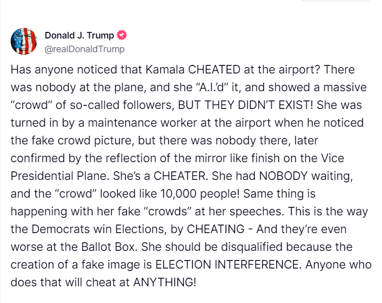وكتب ترامب عبر منصته "تروث سوشيال" متسائلًا: "هل لاحظ أحدكم أن كامالا قامت بمخادعتنا في المطار؟ لم يكن هناك أحد، وقد أجرت تعديلا بالذكاء الاصطناعي، وأظهرت حشدًا هائلًا من الناس في استقبالها، لكنهم لم يكونوا موجودين!".