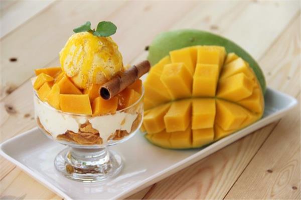 - ثم يقدم فى بولات الآيس كريم ويزين بالمانجو حسب الرغبة.