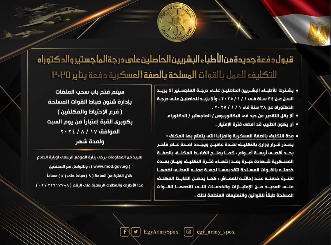 نشرت الصفحة الرسمية للمتحدث العسكري للقوات المسلحة المصرية شروط قبول دفعة جديدة من الأطباء البشريين الحاصلين على درجة الماجستير والدكتوراه للعمل كضباط مكلفين بالقوات المسلحة بالصفة العسكرية دفعة يناير 2025.