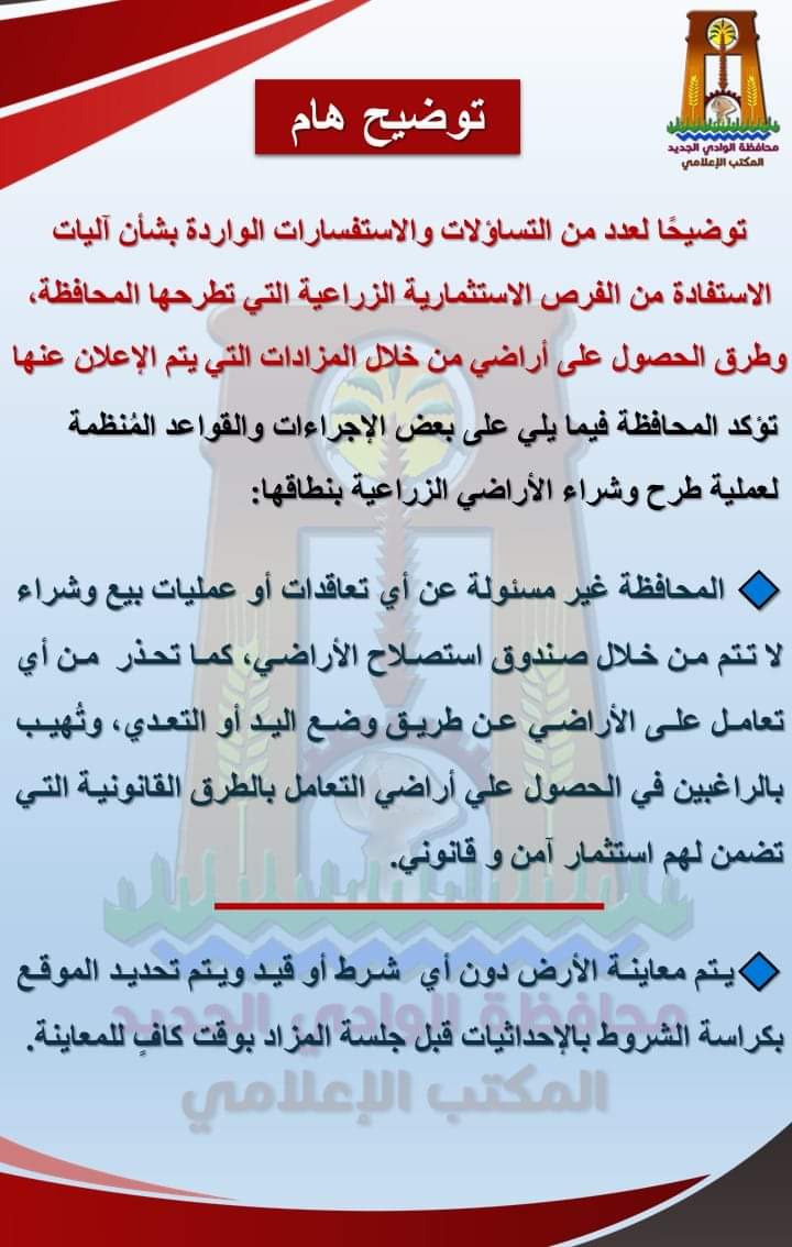 نشرت محافظة الوادي الجديد، في بيان رسمي لها على صفحتها على موقع التواصل الإجتماعي، توضيحًا لعدد من التساؤلات والاستفسارات الواردة بشأن آليات الاستفادة من الفرص الاستثمارية الزراعية التي تطرحها المحافظة، وطرق الحصول على أراضي من خلال المزادات التي يتم الإعلان عنها.