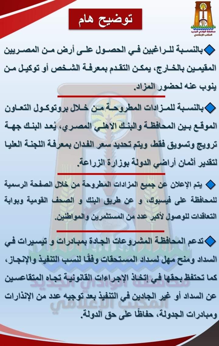 وجاء في بيان الوادي الجديد، أنه بالنسبة للمزادات المطروحة من خلال بروتوكول التعاون الموقع بين المحافظة والبنك الأهلي المصري، يُعد البنك جهة ترويج وتسويق فقط ويتم تحديد سعر الفدان بمعرفة اللجنة العليا لتقدير أثمان أراضي الدولة بوزارة الزراعة.