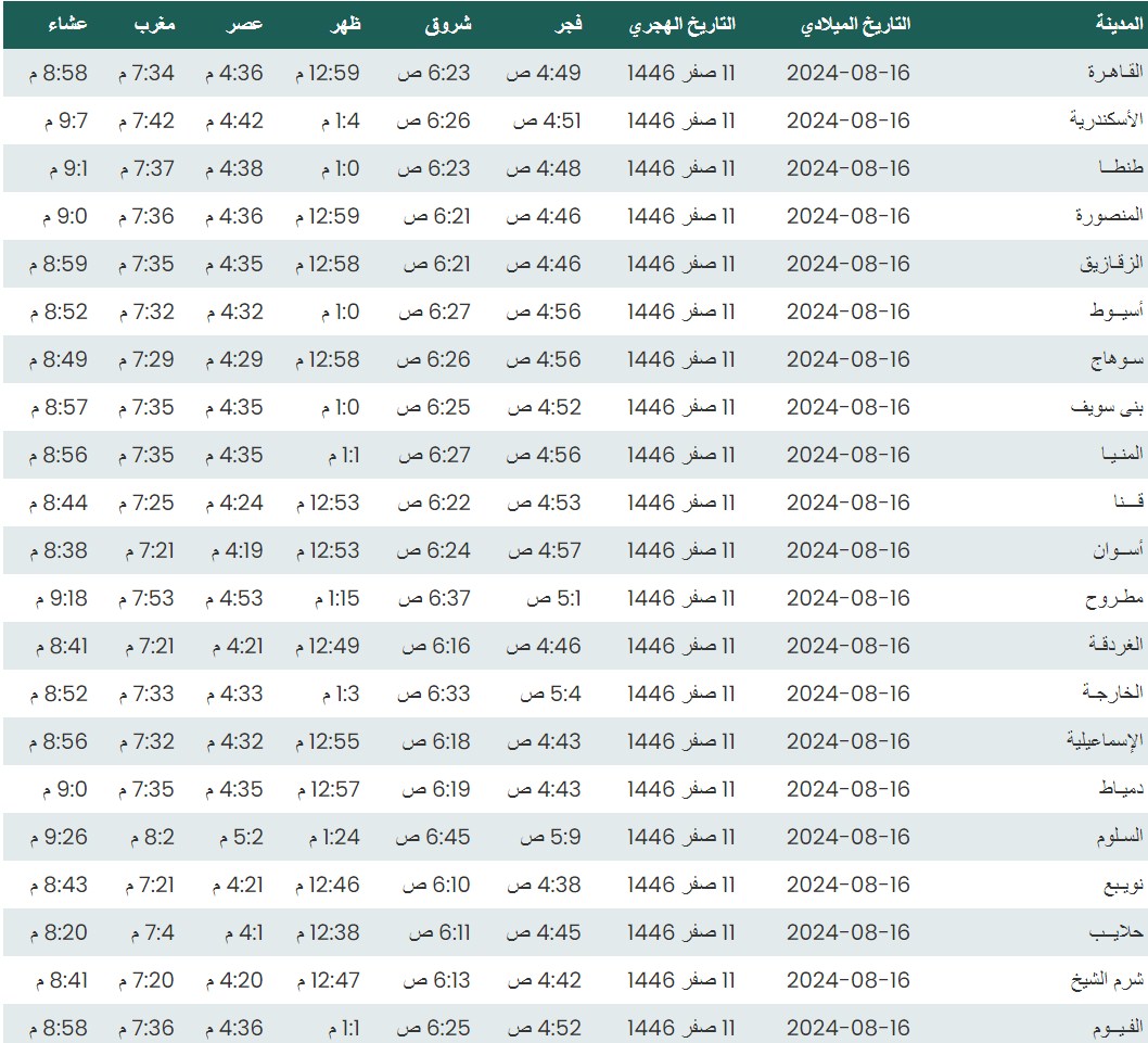 مواقيت الصلاة اليوم وفقًا للتوقيت المحلي لمدينتي القاهرة والإسكندرية وكذلك،مواقيت الصلاة، لعدد من مدن ومحافظات الجمهورية من واقع بيانات الهيئة العامة للمساحة