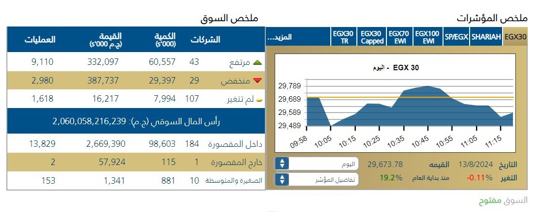 التحليل الفني لمؤشرات البورصة المصرية، تباينت مؤشرات البورصة المصرية بحركة تداولات جلسة اليوم الثلاثاء الموافق 13 أغسطس 2024.