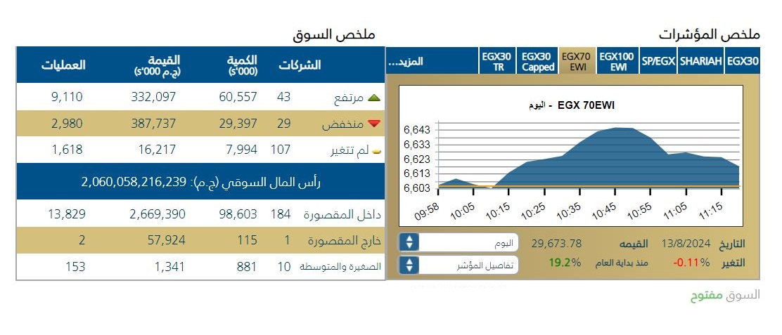 - صعد مؤشر الشركات الصغيرة والمتوسطة "إيجي إكس 70 متساوي الأوزان" بنسبة 0.23% عند مستوى 6620 نقطة.