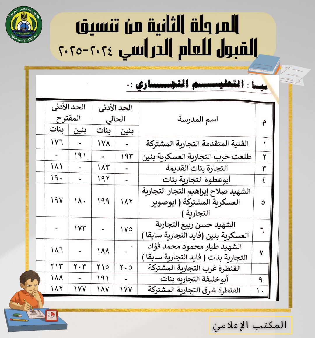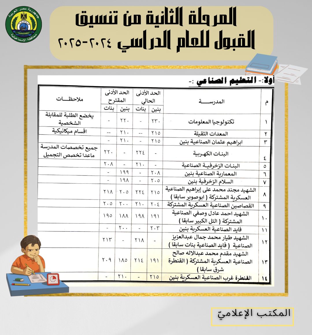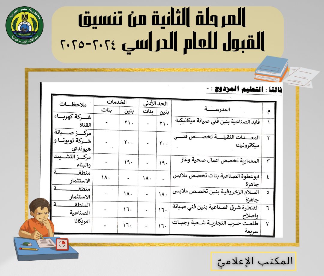كما اعتمد محافظ الإسماعيلية المرحلة الثانية من تنسيق القبول بمدارس التعليم الفني الصناعي والتجاري والزراعي والتعليم المزدوج، وفقًا للجداول المرفقة.