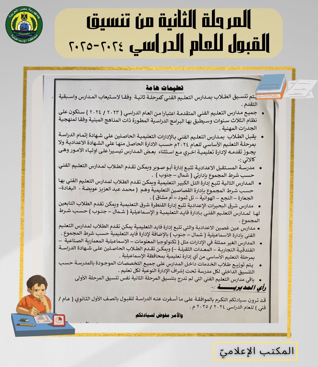 محافظ الإسماعيلية يعتمد نتيجة الدور الثاني للإعدادية، وخفض تنسيق الالتحاق بالثانوية (صور)
