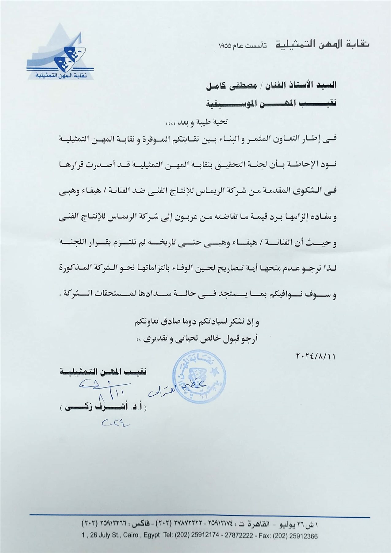 وطلب أشرف ذكي من مصطفى كامل تفعيل دور اتحاد النقابات بضرورة التعاون المفروض قانونيًا وأدبيًا وإداريًا، حيث أخلت الفنانة هيفاء وهبي ببنود تعاقد فني بينها وبين شركة إنتاج سينمائي رغم حصولها على عربون التعاقد ولم تنفذ ما جاء بقرار لجنة التحقيق بنقابة المهن التمثيلية والذي تلاه إيقافها عن العمل ومنع التصريح لها مجددًا.